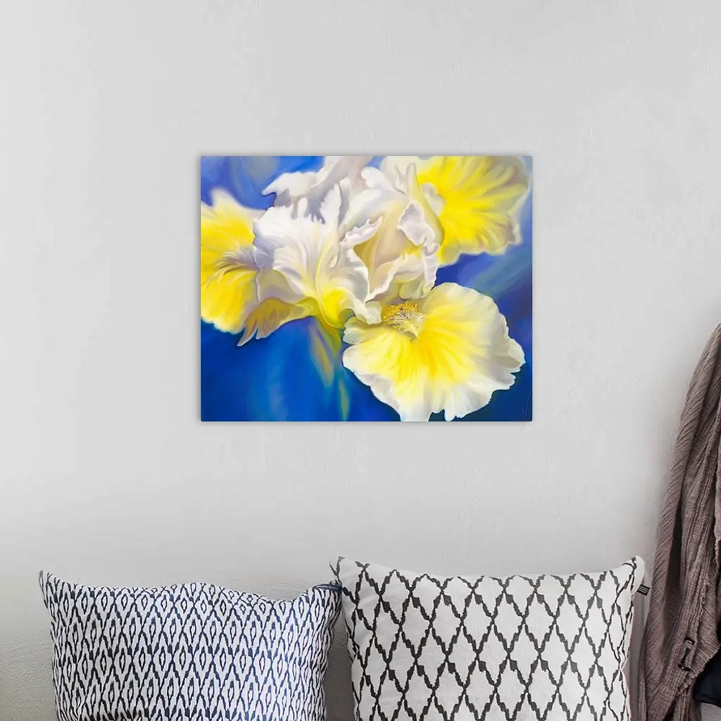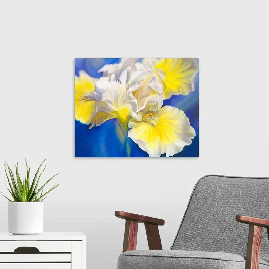 Refreshed is a big flower painting of a yellow and white bearded iris sitting on a rich blue background. It brings a burst of joy and an uplifting mood to a room.