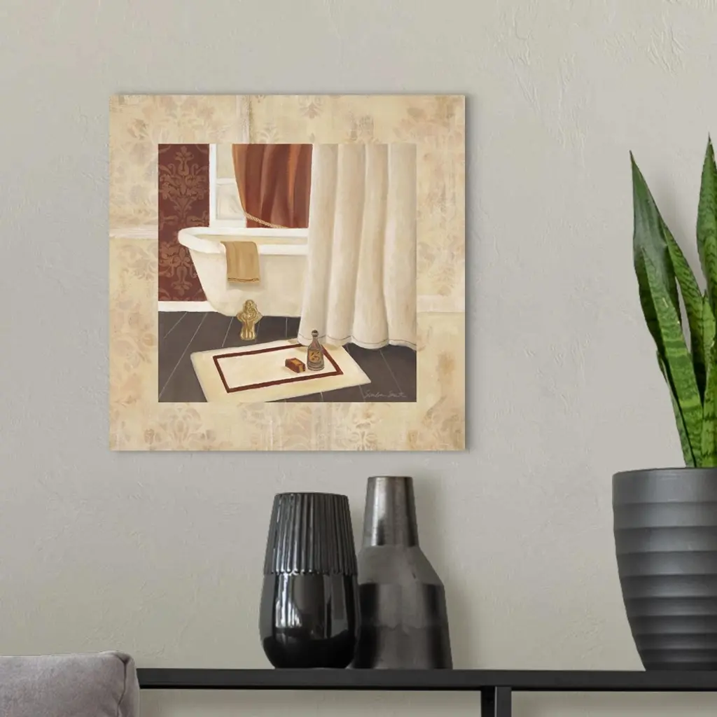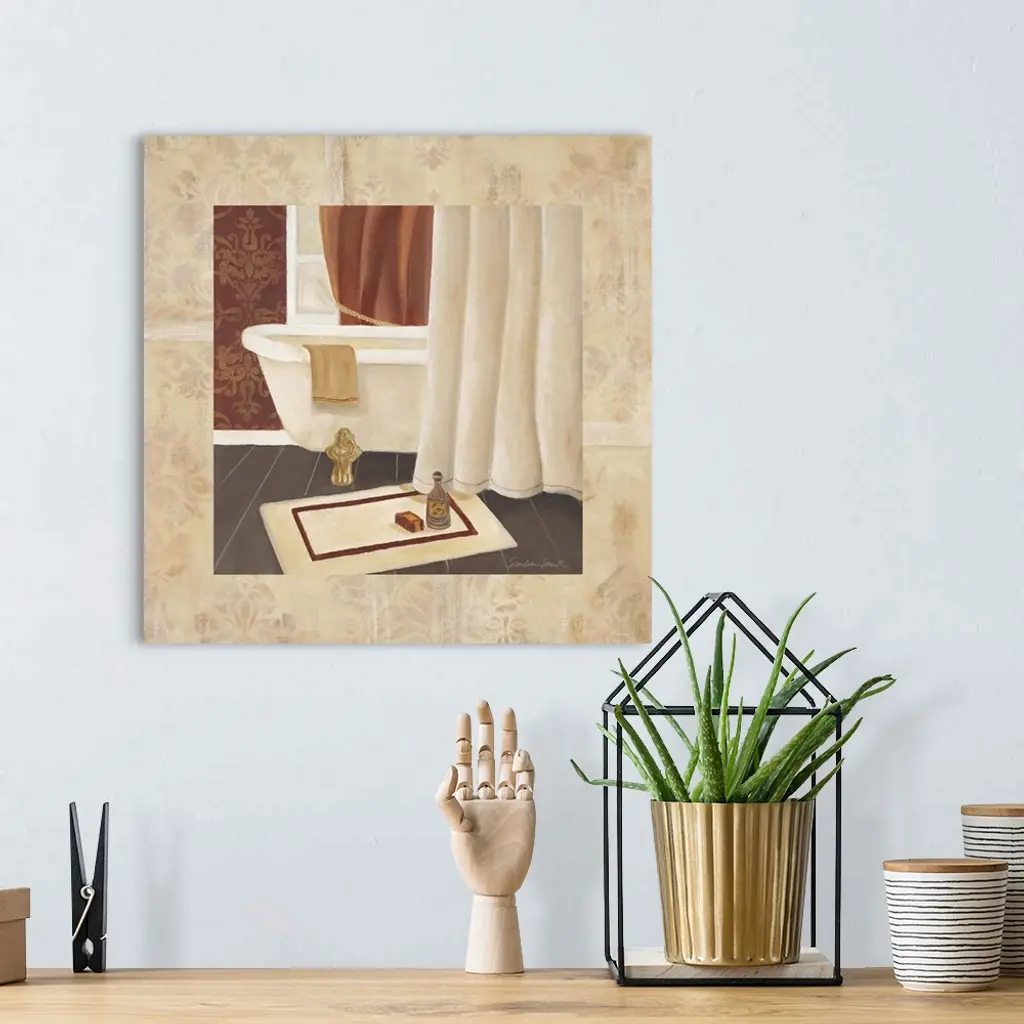 Square painting of a fancy bathtub behind a curtain in a luxury bathroom.