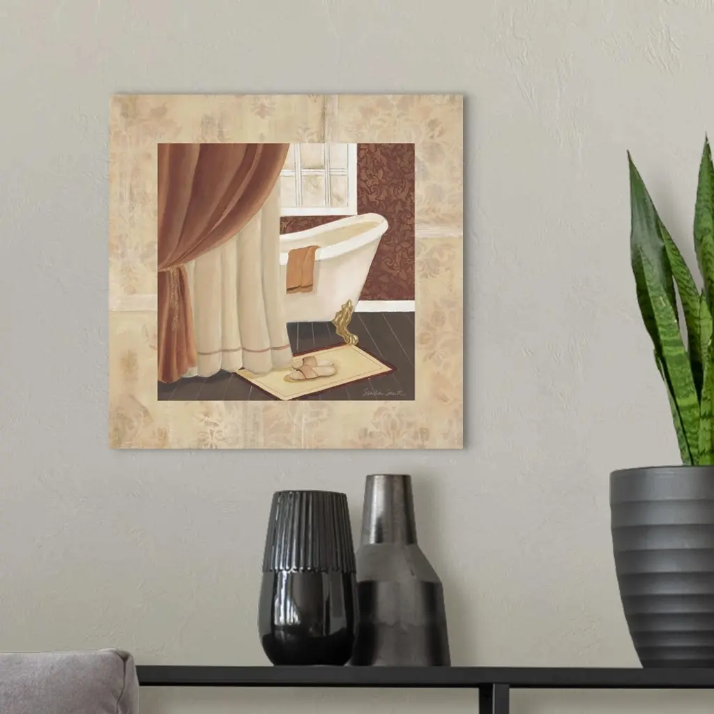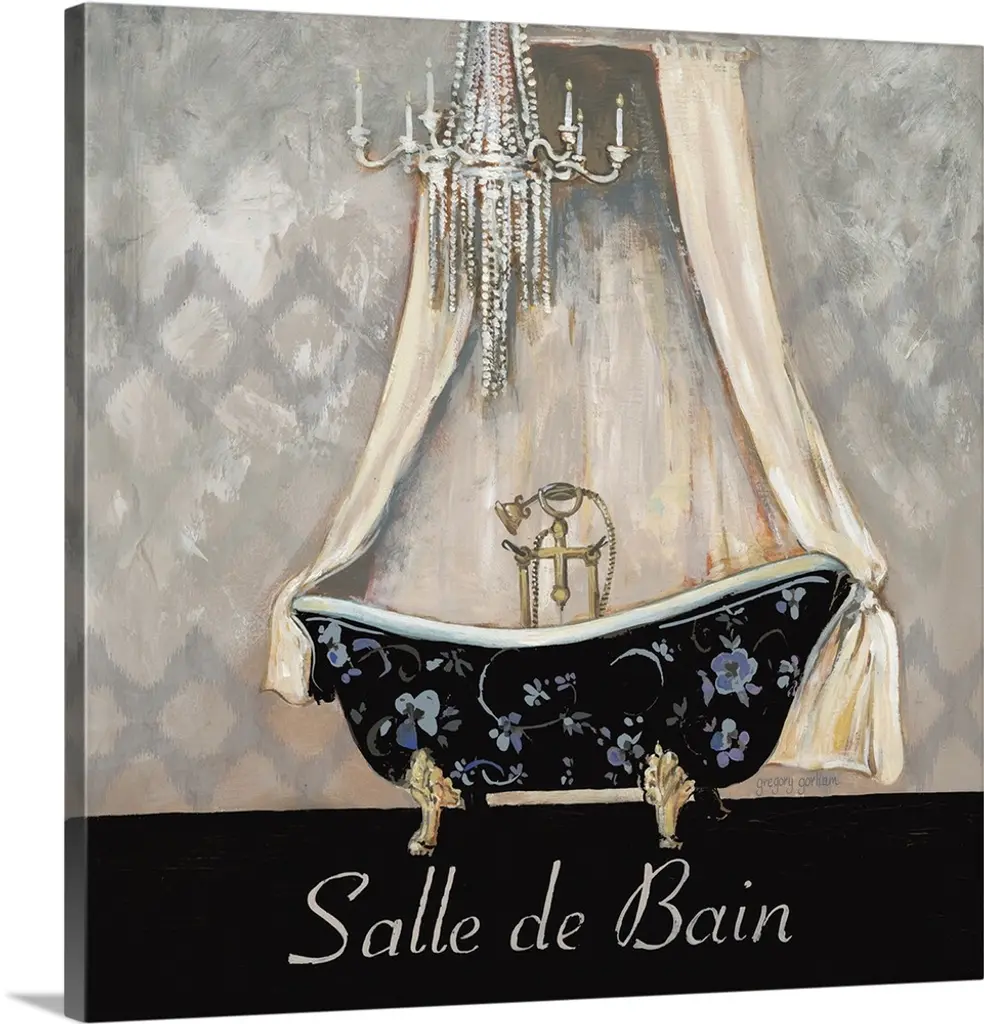 Square painting of a fancy bathtub behind a curtain in a luxury bathroom.