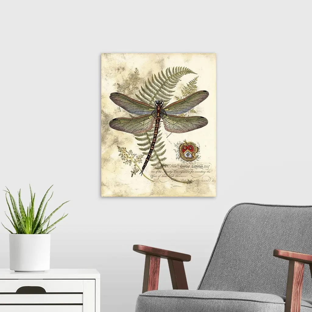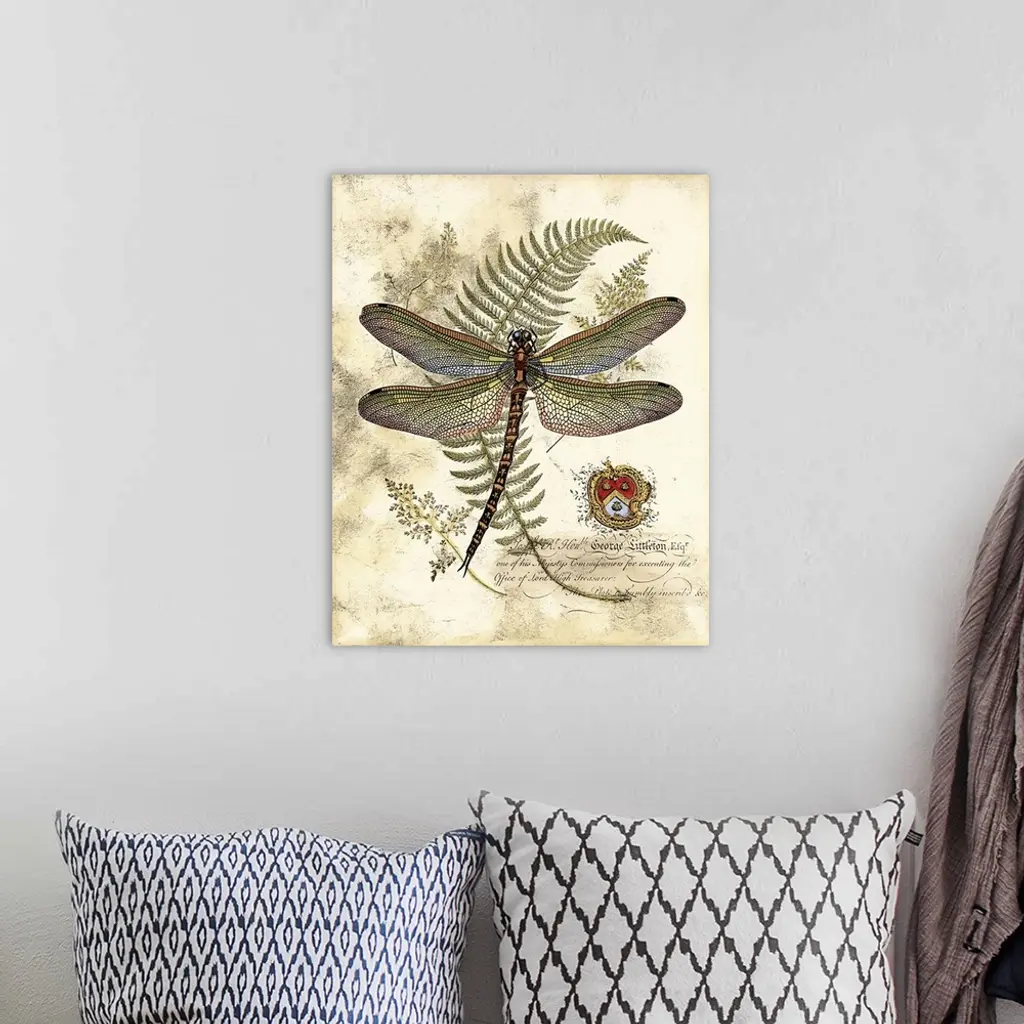 Contemporary artwork of a dragonfly and fern frond against a weathered beige background.