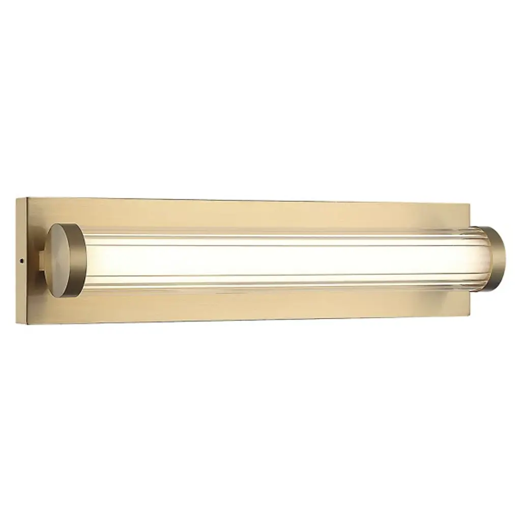 The Regan LED Vanity Light from Alder & Ore combines clear ribbed outer glass with inner opal glass in a columnar shade design. The dual-glass construction creates a layered effect, with the ribbed exterior adding texture and the opal interior ensuring even illumination distribution. LED technology enables adjustable color temperature settings to accommodate various lighting preferences, and the horizontal metal backplate works well above bathroom mirrors or vanity areas, where task lighting is essential.