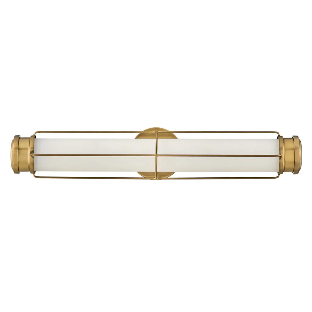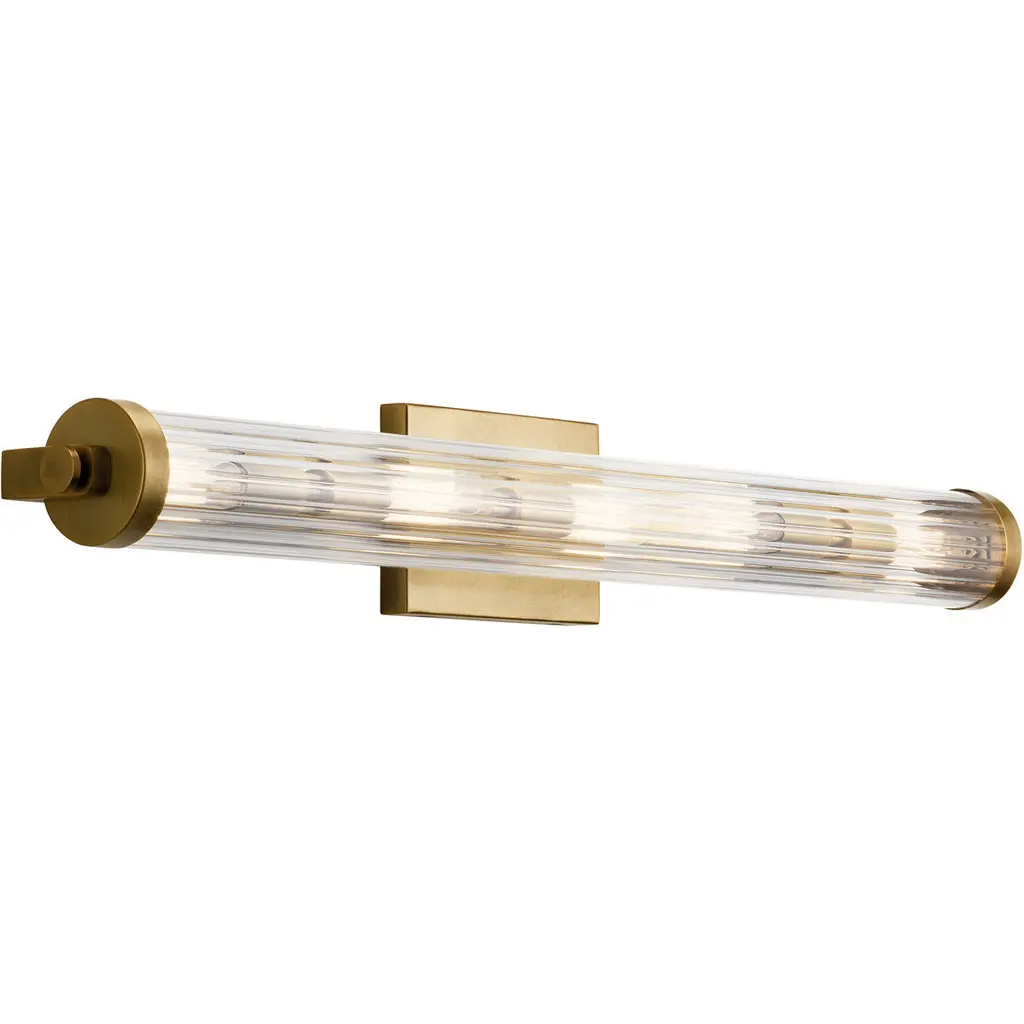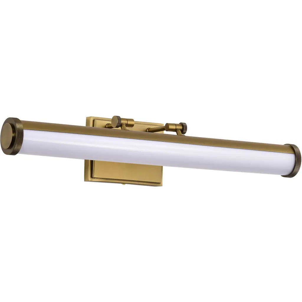 The Regan LED Vanity Light from Alder & Ore combines clear ribbed outer glass with inner opal glass in a columnar shade design. The dual-glass construction creates a layered effect, with the ribbed exterior adding texture and the opal interior ensuring even illumination distribution. LED technology enables adjustable color temperature settings to accommodate various lighting preferences, and the horizontal metal backplate works well above bathroom mirrors or vanity areas, where task lighting is essential.