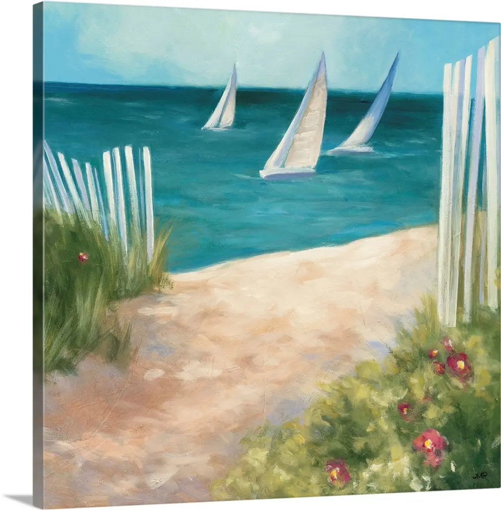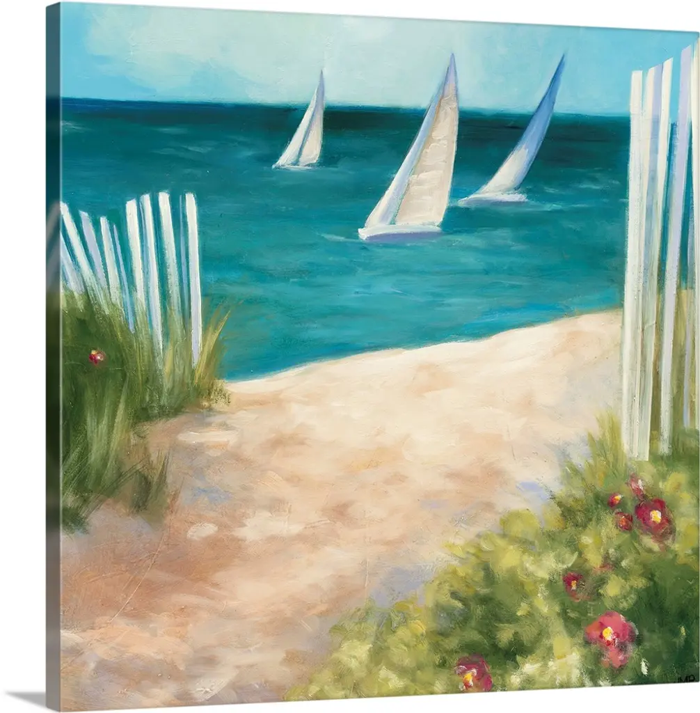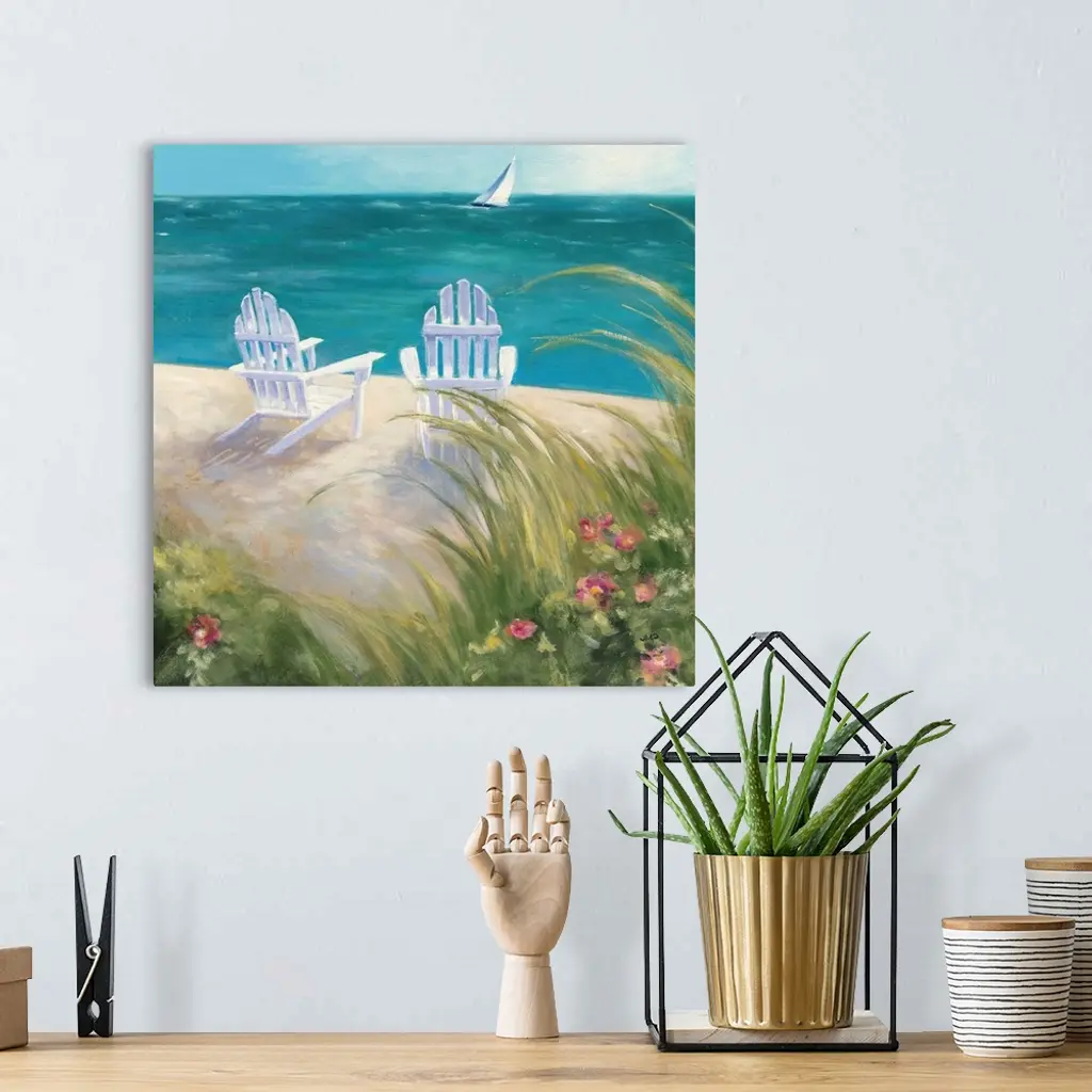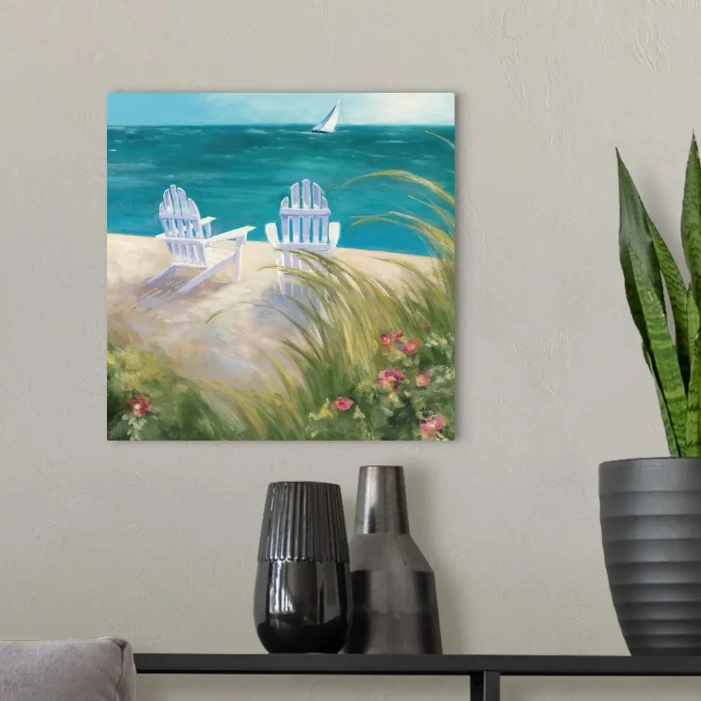 Relaxing painting of two white adirondack chairs on the beach with a sailboat in the ocean off in the distance.