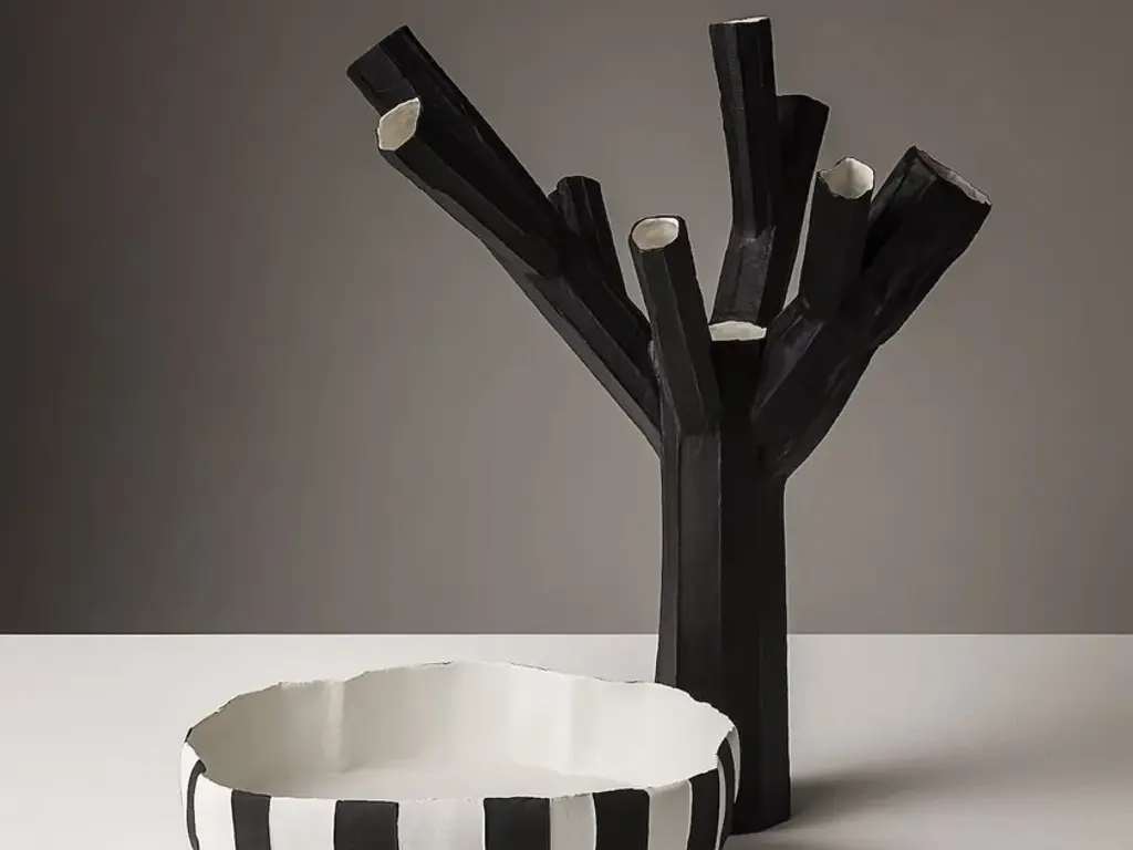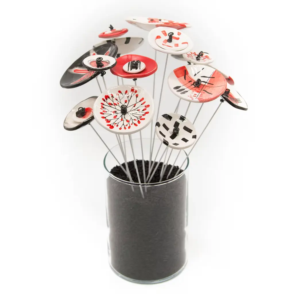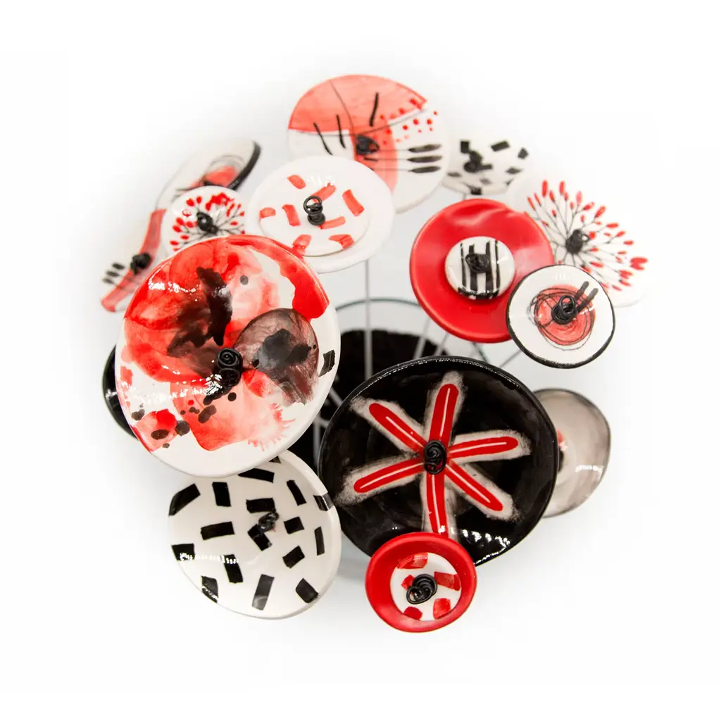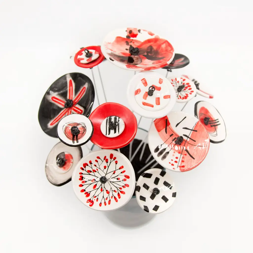 Minute manual gestures of molding and painting are behind the fifteen ceramic flowers composing this glamorous bouquet. Geometric patterns, petals, and blotched decorations alternately adorn the ceramic corollas, for a design whose striking visual impact gets further emphasized by a daring chromatic selection. Completed by extra-thin metal stems, the bouquet is delivered together with a cylindrical vase.