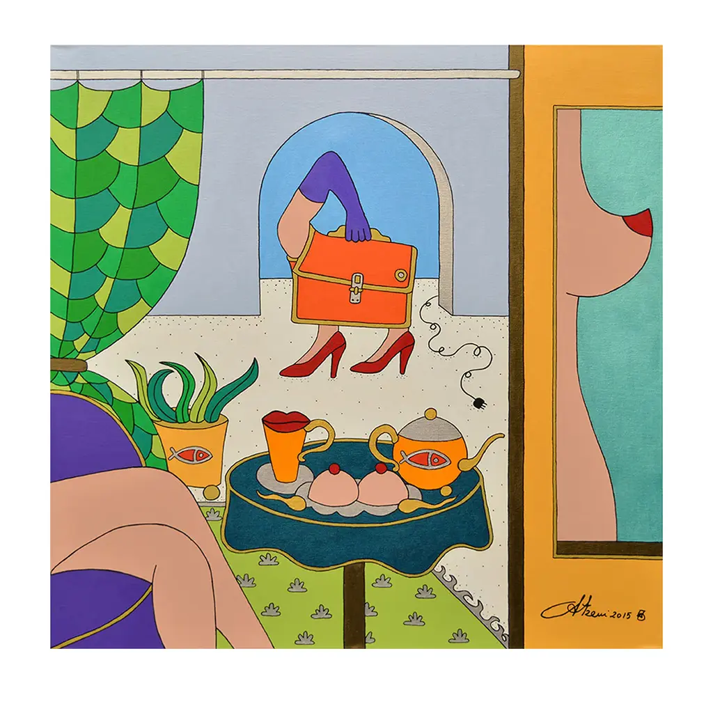 A celebration of the Made in Italy, particularly Neapolitan pizza, this extraordinary artwork by Giampaolo Atzeni exudes a surrealist inspiration of iconic character. An acrylic artwork on canvas, it is filled with symbols referring to the city of Naples: the Vesuvio Vulcan, the sea and the sun, joy, and the horn-shaped charms. Mounted on a wooden support, it comes with an authenticity certificate.