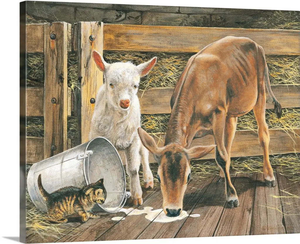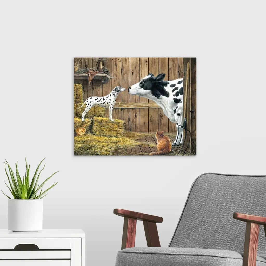 Contemporary painting of a cow and dalmatian standing nose to nose staring at each other.