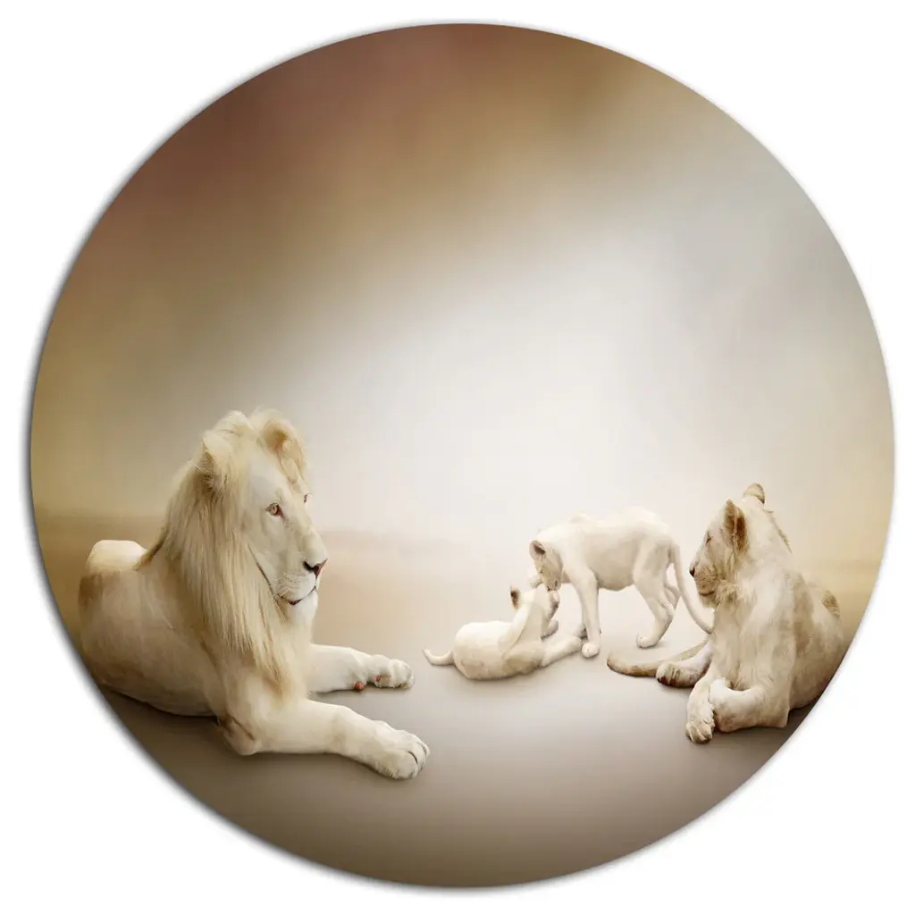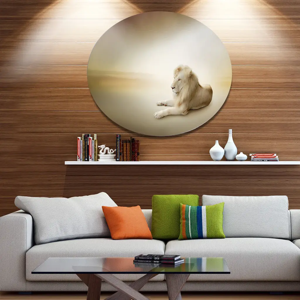 Bring Contemporary Abstraction to your home with this large Circle Metal wall art. This Relaxing King of Animals Metal Artwork makes it the focal point of any room or office. - White Gloss Coating ensures colors are extra vibrant with light reflection.- Aluminum grade Sheet Metal with 1 inch mounting frame on the back giving the illusion that the artwork is floating on the wall..- Mounting Brackets are included along with instructions.- High Quality Digital images are created directly into a glossy aluminum panel producing a stunning and captivating print into the glossy finish of the metal.- Water, Fire and Scratch resistant HD Aluminum panels.- Looks better than any photo paper and guaranteed to last at least 20 years- Easy to clean with a microfiber cloth. Colors are far superior to regular Canvas Art. - Easy to Hang