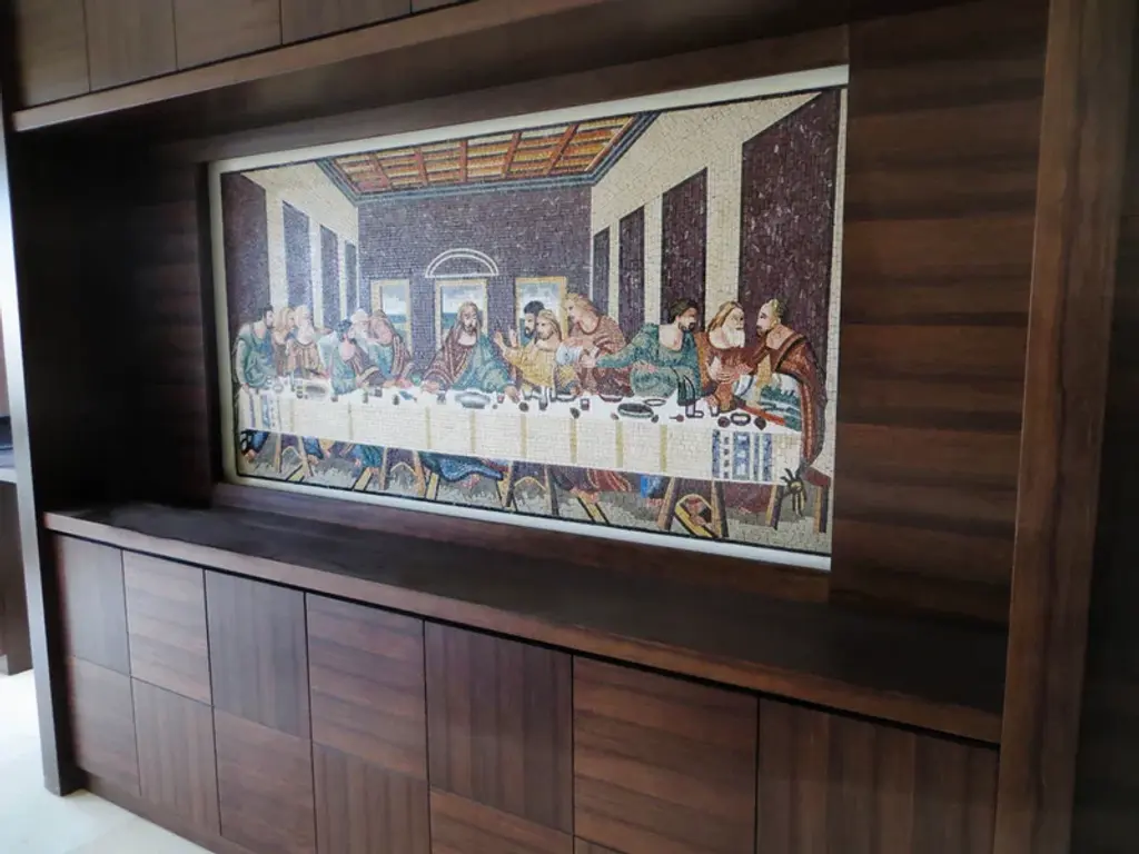 Introducing our exquisite product, "Religious Mosaics - The Last Supper." This stunning mosaic reproduction captures one of the most iconic religious artworks in history, originally painted by Leonardo da Vinci and housed in the renowned convent of Santa Maria delle Grazie in Milan, Italy. Our meticulously crafted mosaic brings the beauty and depth of this masterpiece into your home, allowing you to connect with a pivotal moment in Christian art and spirituality.Each piece in our religious mosaic collection is designed to be not just wall art but a profound expression of faith. The Last Supper is depicted with incredible detail, showcasing the expressions and interactions of Jesus and his disciples during this significant moment. The vibrant colors and intricate patterns of the mosaic create a captivating visual experience that draws the eye and ignites the spirit.Our mosaics are more than decorative items; they are meaningful representations of belief and culture, perfect for any space that promotes reflection and inspiration. Whether you hang it in a living room, dining area, or place of worship, this artwork serves as a powerful reminder of faith, unity, and the teachings of Jesus.In addition to our selection of revered religious designs, we offer custom mosaic options for those seeking a personalized touch. If you have a specific holy design in mind, you can choose from our standard collection or collaborate with us to create a unique mosaic that reflects your individual faith journey. Transform your spiritual aspirations into a lasting work of art that can be cherished for generations.Let "Religious Mosaics - The Last Supper" be a centerpiece in your home, a conversation starter, and a source of inspiration for all who encounter it. Embrace the beauty of faith through art and make this magnificent piece a part of your spiritual décor today.