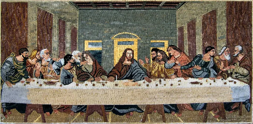 Introducing our exquisite product, "Religious Mosaics - The Last Supper." This stunning mosaic reproduction captures one of the most iconic religious artworks in history, originally painted by Leonardo da Vinci and housed in the renowned convent of Santa Maria delle Grazie in Milan, Italy. Our meticulously crafted mosaic brings the beauty and depth of this masterpiece into your home, allowing you to connect with a pivotal moment in Christian art and spirituality.Each piece in our religious mosaic collection is designed to be not just wall art but a profound expression of faith. The Last Supper is depicted with incredible detail, showcasing the expressions and interactions of Jesus and his disciples during this significant moment. The vibrant colors and intricate patterns of the mosaic create a captivating visual experience that draws the eye and ignites the spirit.Our mosaics are more than decorative items; they are meaningful representations of belief and culture, perfect for any space that promotes reflection and inspiration. Whether you hang it in a living room, dining area, or place of worship, this artwork serves as a powerful reminder of faith, unity, and the teachings of Jesus.In addition to our selection of revered religious designs, we offer custom mosaic options for those seeking a personalized touch. If you have a specific holy design in mind, you can choose from our standard collection or collaborate with us to create a unique mosaic that reflects your individual faith journey. Transform your spiritual aspirations into a lasting work of art that can be cherished for generations.Let "Religious Mosaics - The Last Supper" be a centerpiece in your home, a conversation starter, and a source of inspiration for all who encounter it. Embrace the beauty of faith through art and make this magnificent piece a part of your spiritual décor today.