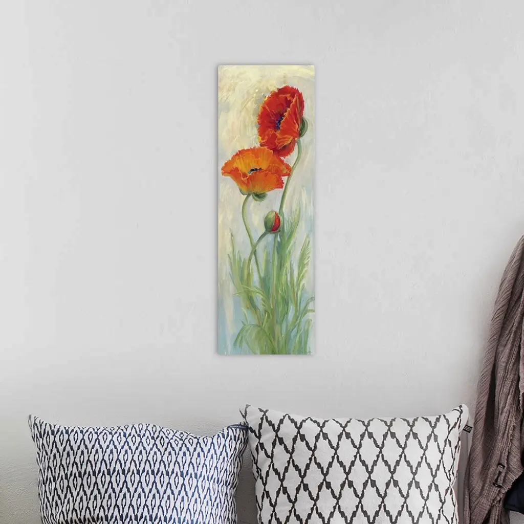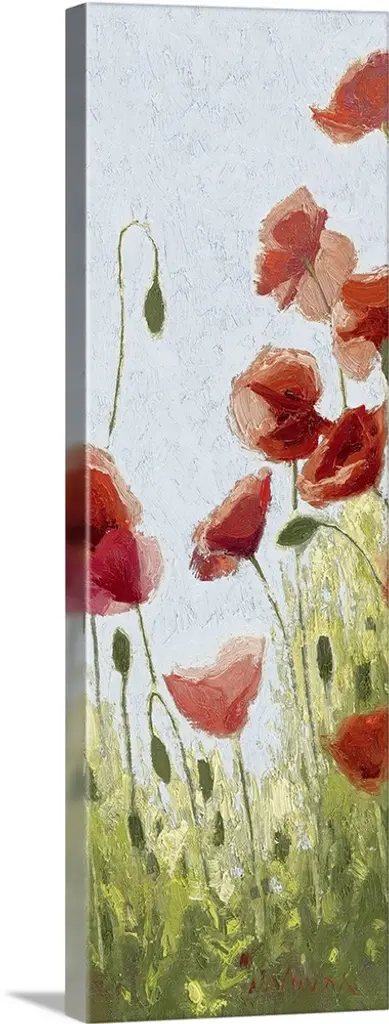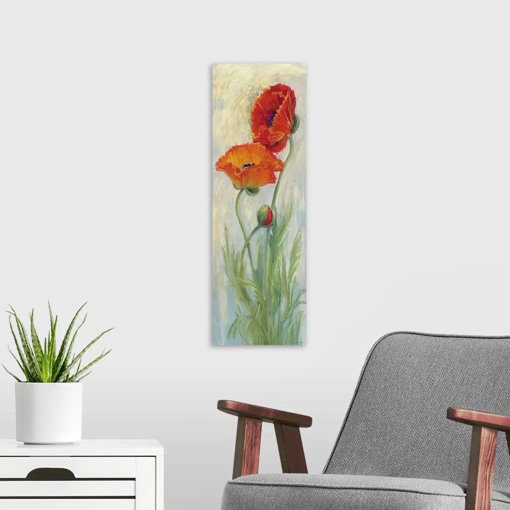 Vertical contemporary painting by Carol Rowan of long stemmed red poppies on a soft background.