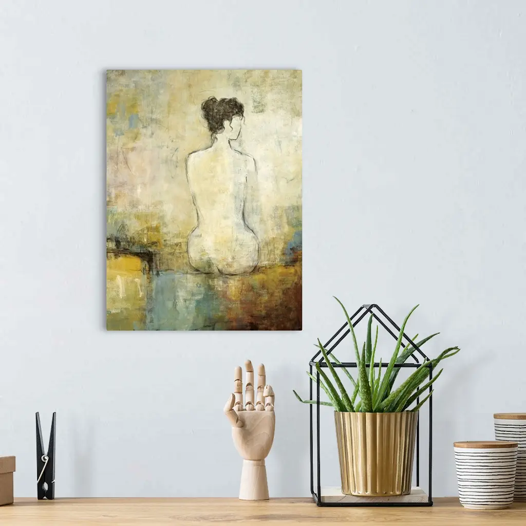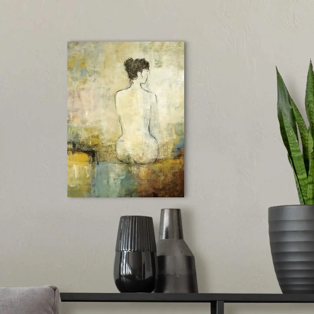 Contemporary painting of woman's silhouette from behind that is sitting on a surface.