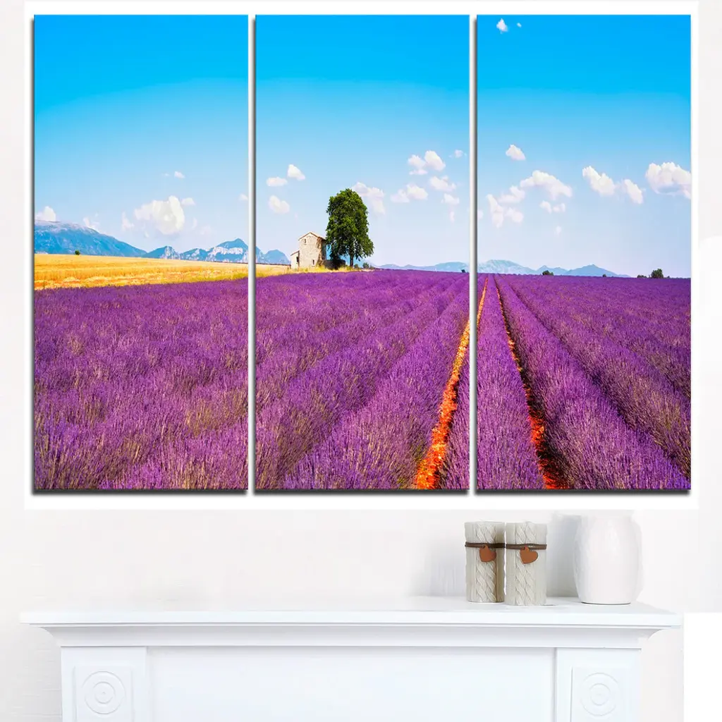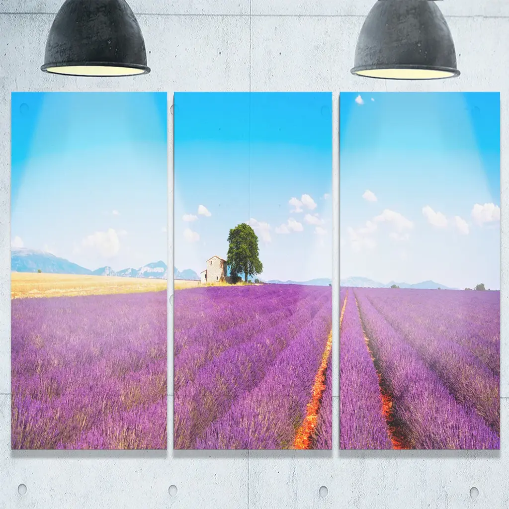 "Remote House And Tree In Lavender Field" Metal Wall Art, 3 Panels, 36"x28"