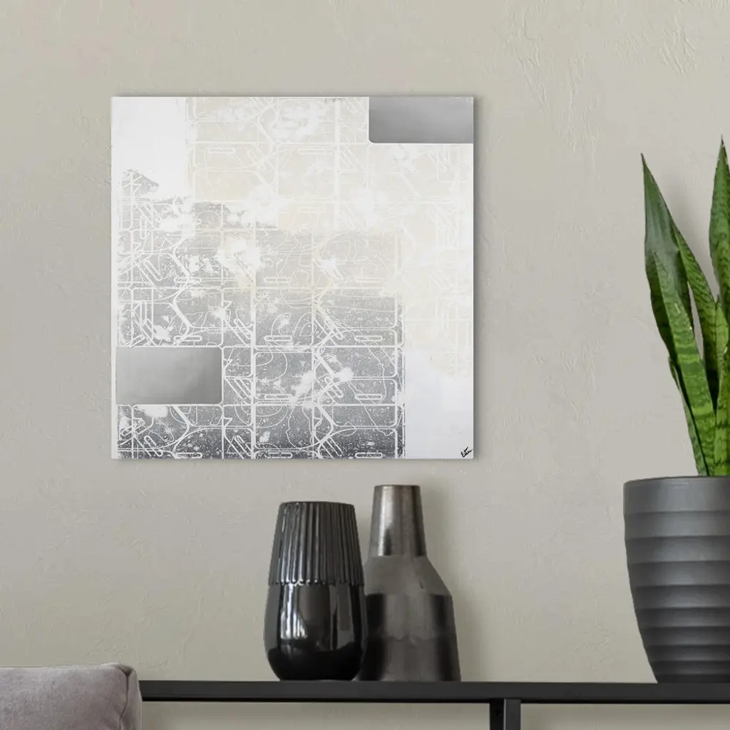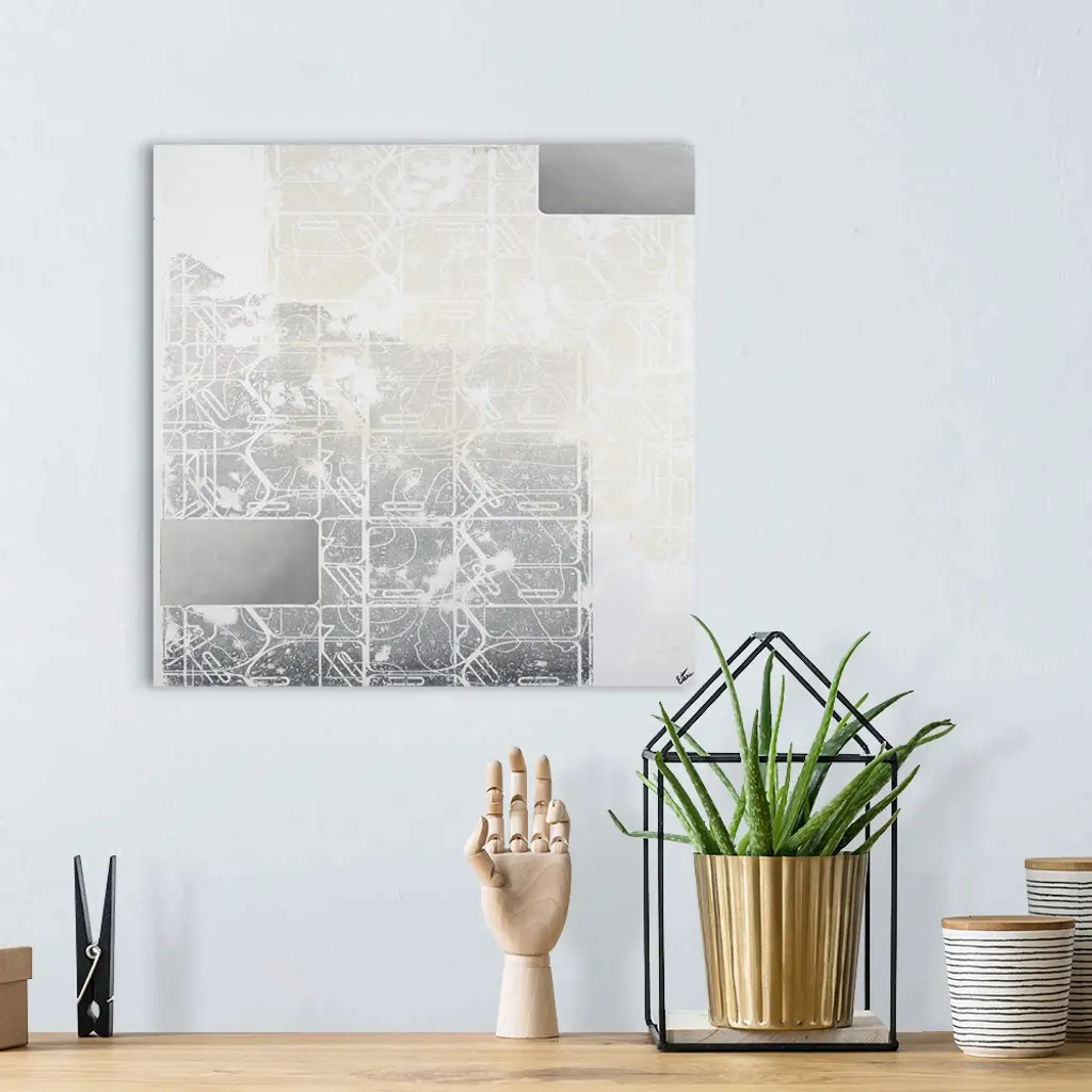 Abstract painting in white, gray, and beige with faint white lined designs making a pattern on the canvas.