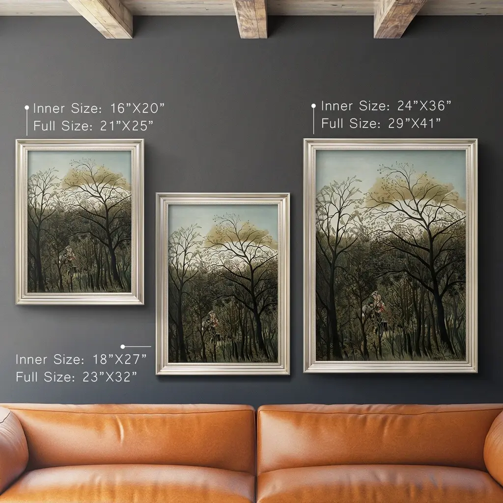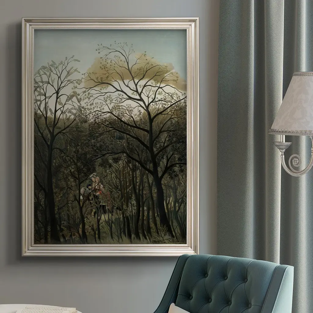 Rendezvous in the Forest Premium Framed Canvas- Ready to Hang A Premium Framed Canvas created to last. Framed in distressed wood and available in an array of sizes and colors Featuring a beveled a solid wood stretcher bar, each piece comes ready to hand 3 SIZES AVAILABLE 16''X20'' - Overall Size 18'X27'' - Overall Size 24''x36'' - Overall Size Each piece is made to order. Each piece comes with hanging hardware. Made in the USA Ready to Hang Giclee Paper Print Acrylic Glass Beveled Matt Board