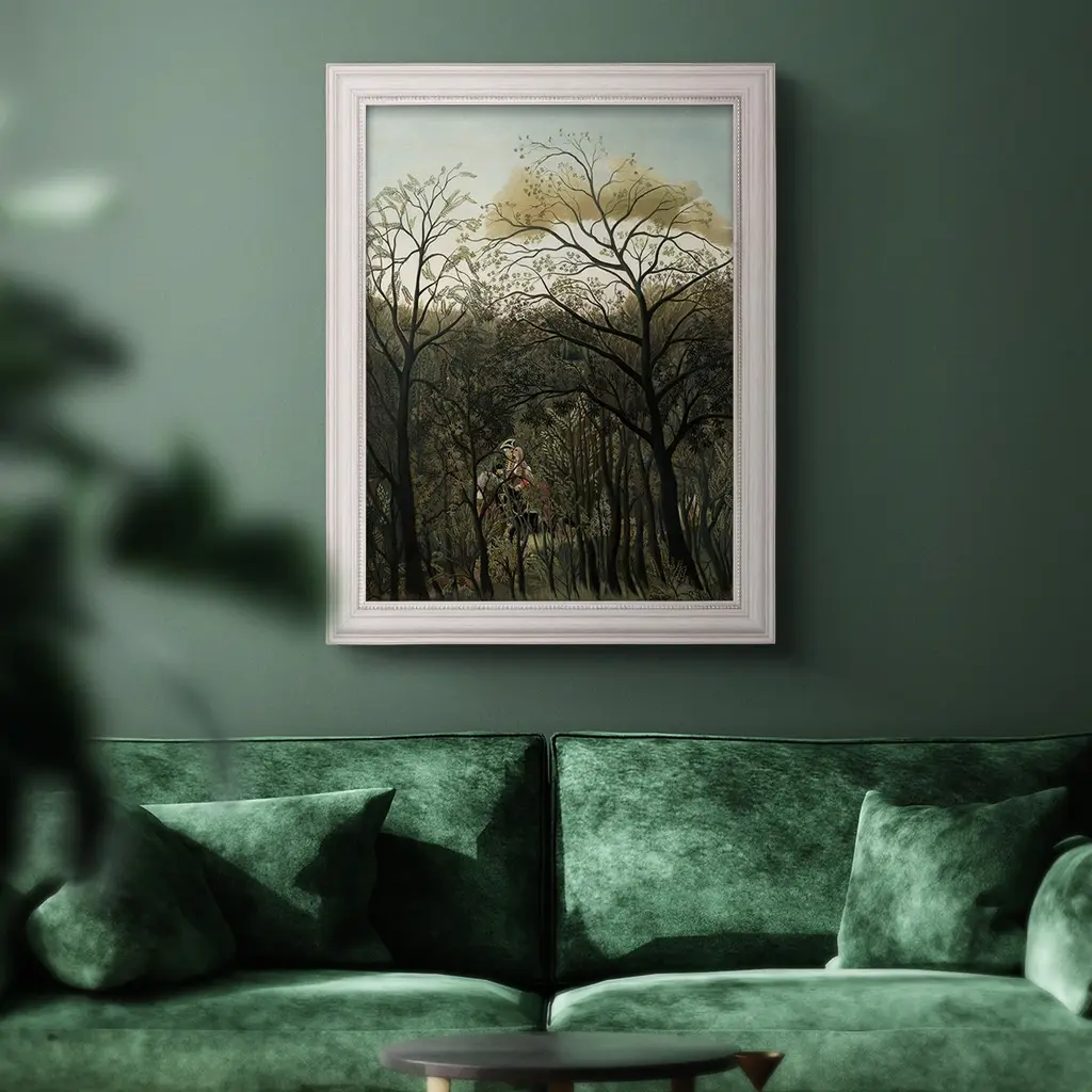 Rendezvous in the Forest Premium Framed Canvas- Ready to Hang A Premium Framed Canvas created to last. Framed in distressed wood and available in an array of sizes and colors Featuring a beveled a solid wood stretcher bar, each piece comes ready to hand 3 SIZES AVAILABLE 16''X20'' - Overall Size 18'X27'' - Overall Size 24''x36'' - Overall Size Each piece is made to order. Each piece comes with hanging hardware. Made in the USA Ready to Hang Giclee Paper Print Acrylic Glass Beveled Matt Board