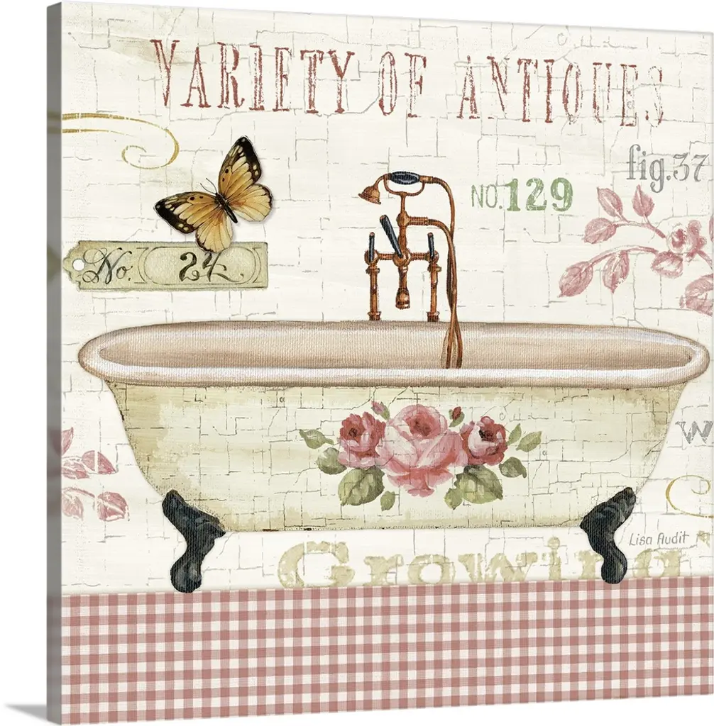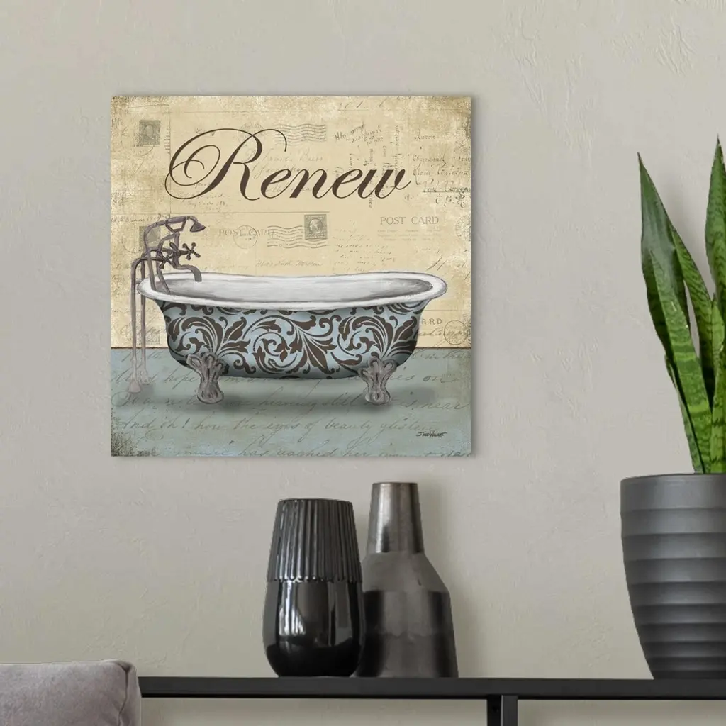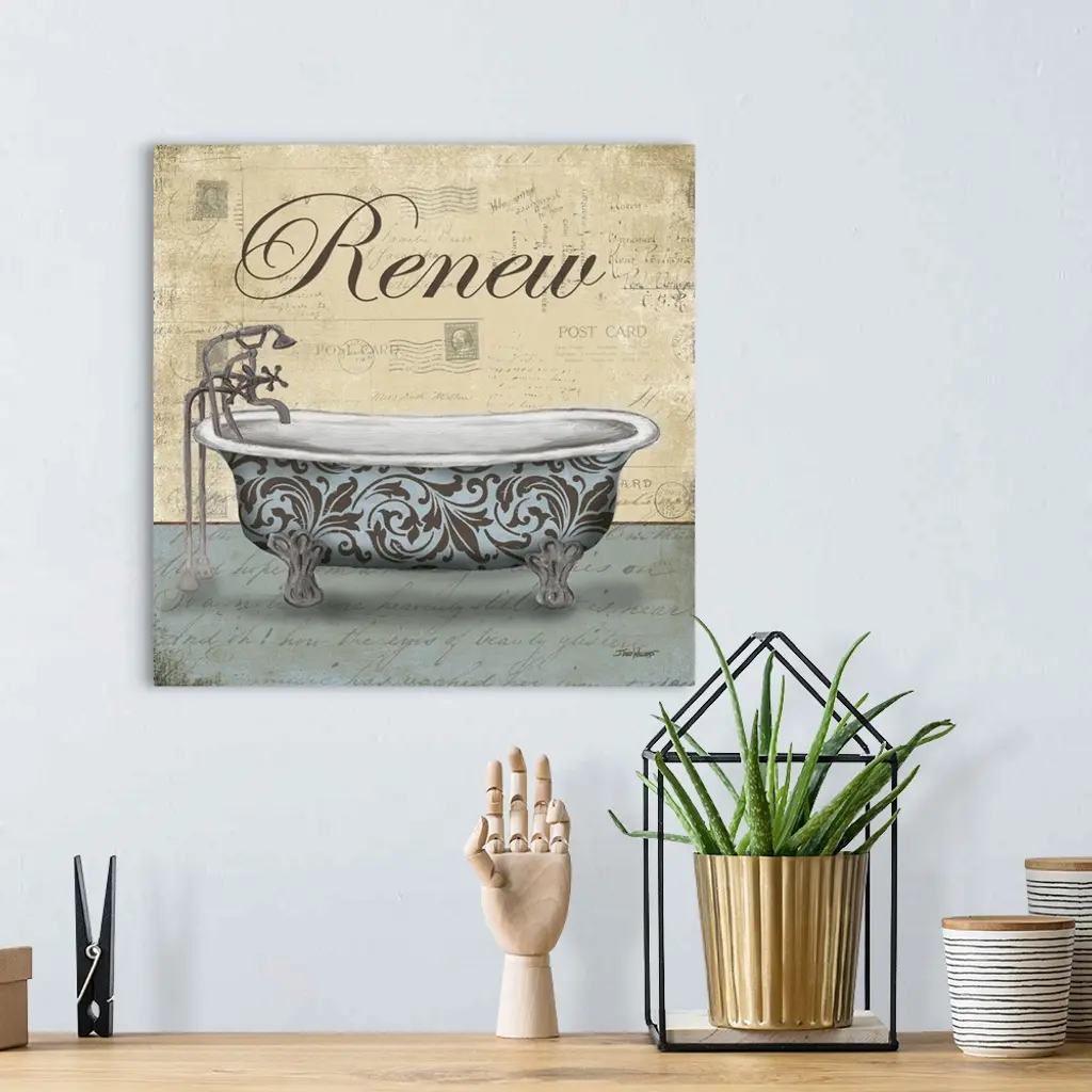 Powder blue, tan, and brown bath decor with a painting of a claw foot bathtub decorated in paisley designs and "Renew" written at the top with faint post card stamps and writing in the background.