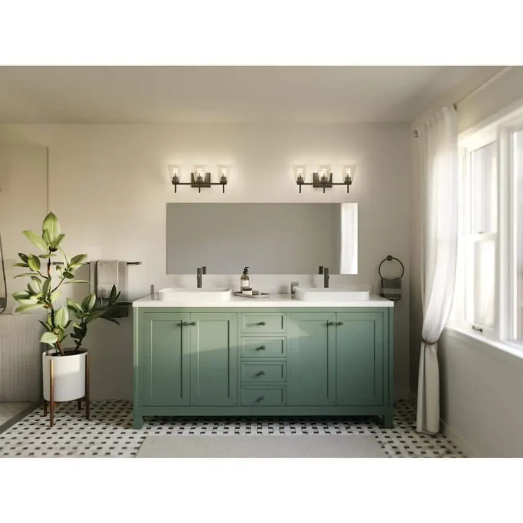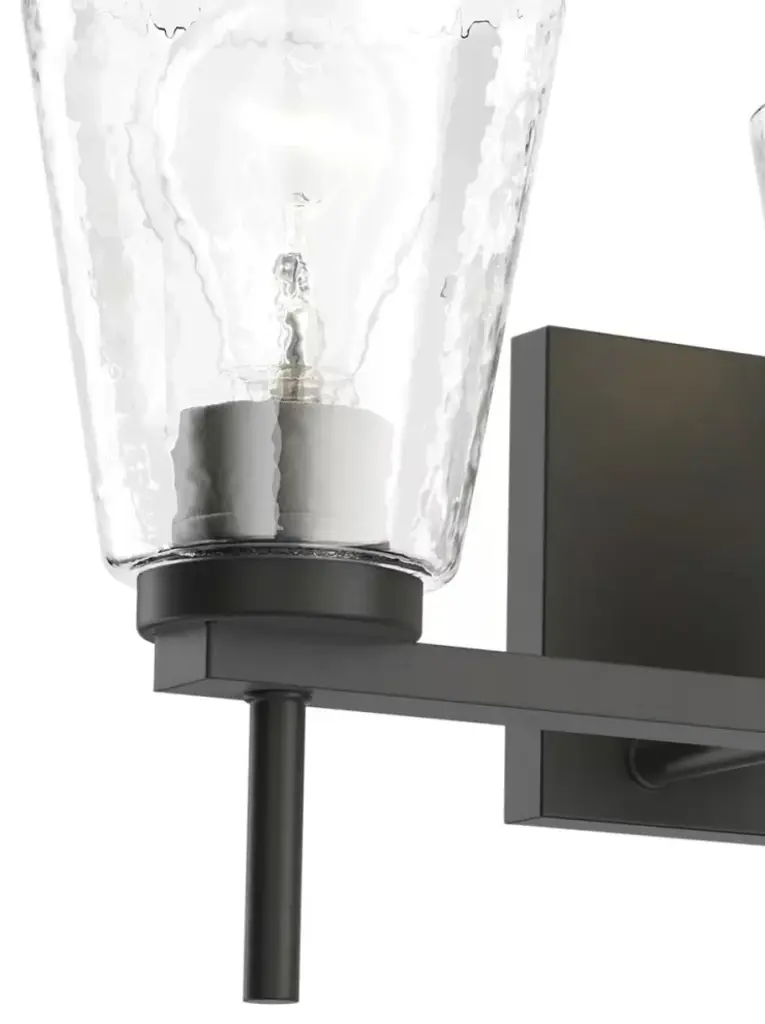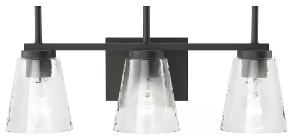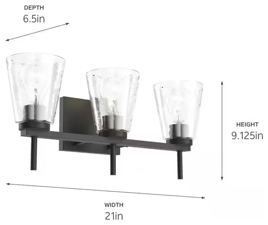 Kichler presents New Renslow 21"W 3-Light Vanity Light by Kichler Black Finish with Hammered Glass Shades. The Renslow 3-light vanity light features a Black finish. The finish is contrasted by clear hammered glass shades, delivering a soft, warm light to any bathroom or powder room. With textured glass and an elegant metalwork stem design, this piece works perfectly with a variety of decors.FINISH - Black finish with hammered glass shades add a remarkable visual appeal with a dappled light effect against the wall and a soft. Works well in transitional and updated traditional environments.DIMENSIONS - 9.88" Height x 21" Width x 6.5" Depth. Mounting Deck Width: 7". Mounting Deck Height: 5".LIGHTING - Requires 3 medium base E26 up to 60-Watt bulb. LED bulbs recommended for energy-savings and long bulb life. (Bulb not Included). FEATURES - Dimmable light. Can be adjusted to different levels of brightness to create your desired ambiance. Compatible with standard wall dimmers. Mount up or down over a bathroom or vanity mirror to create your own look and style. Glass can be removed for easy cleaning.EASY INSTALLATION - Hardwired power source. All mounting hardware and detail instructions included for an easy installation. ETL listing demonstrates that this fixture has met or exceeded the UL/CSA Standard safety requirements. Damp rated for use in bathrooms Weight: 6.5 lbs.