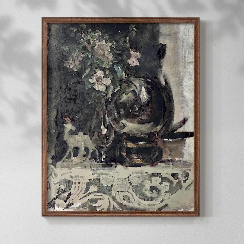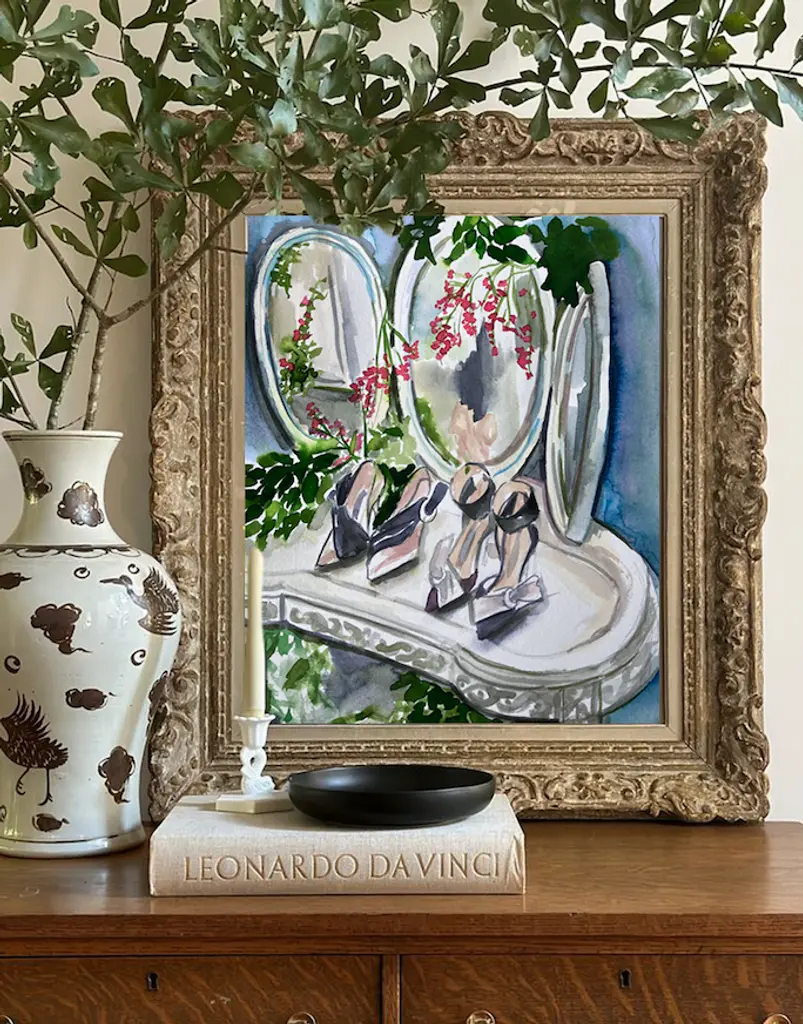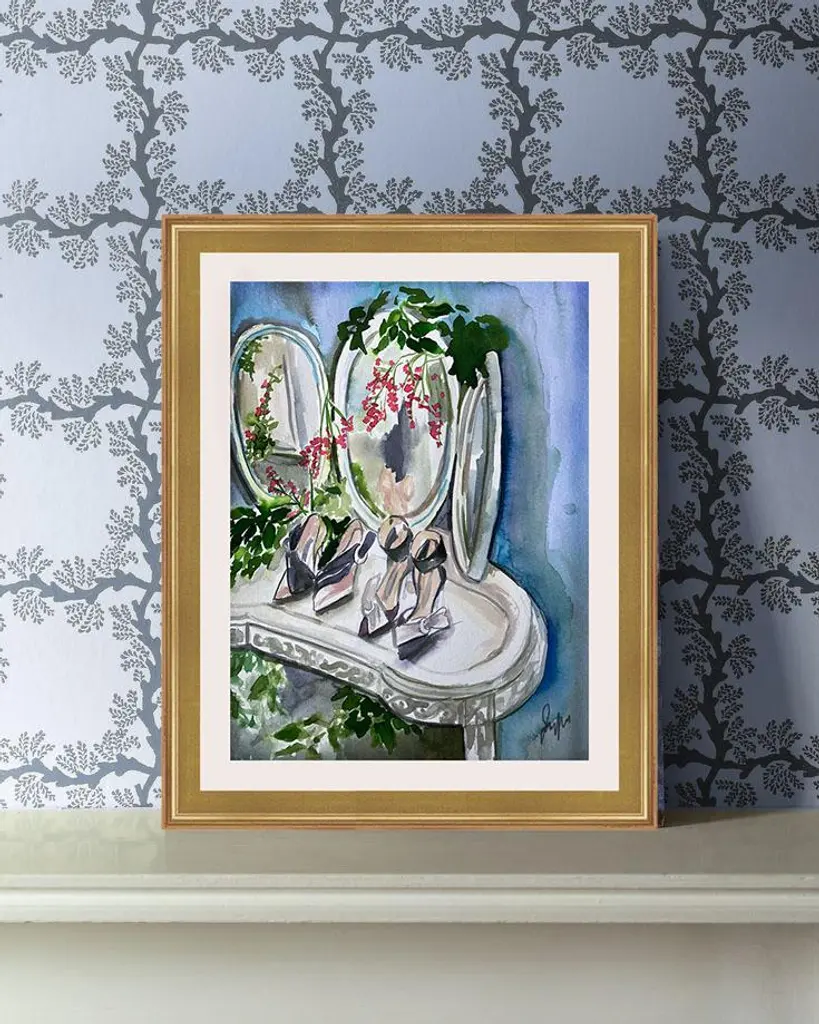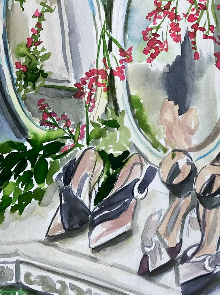 "Reflections Upon a Vanity," Original print of whimsical shoes on a vanity accented with loose feminine florals. Watercolor painting illustrated and signed by New York based artist, JH Mintz. Artwork is 11"x14" not including a custom novelty gold frame and sheet glass protector.