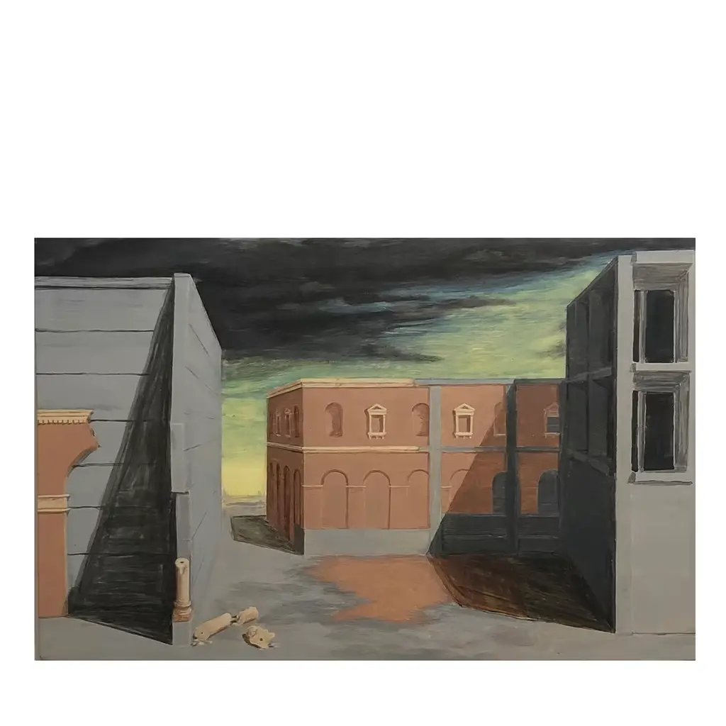 Part of the Residui series, this marvelous and one-off artwork is made using tempera on wood. It depicts a purposely disharmonious juxtaposition of ancient and modern ruins, reminiscent of empty vessels, where human presence is absent. perhaps after having irrevocably vanished, or rejected its former identity. This product is part of the current exhibition "On Returning" at Artemest Galleria.