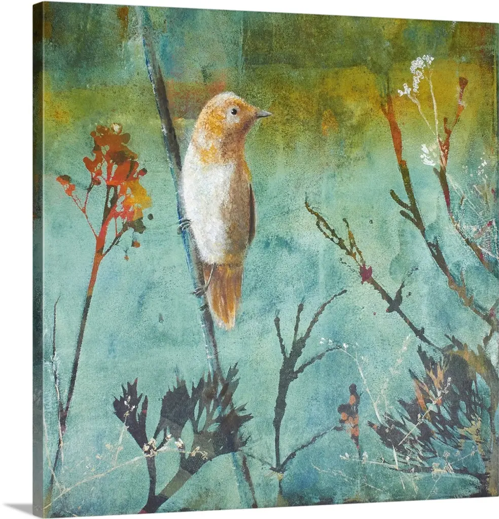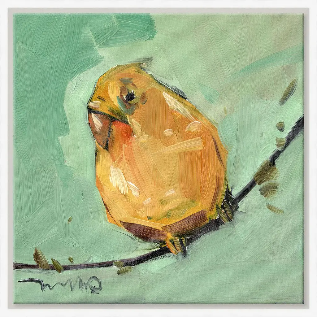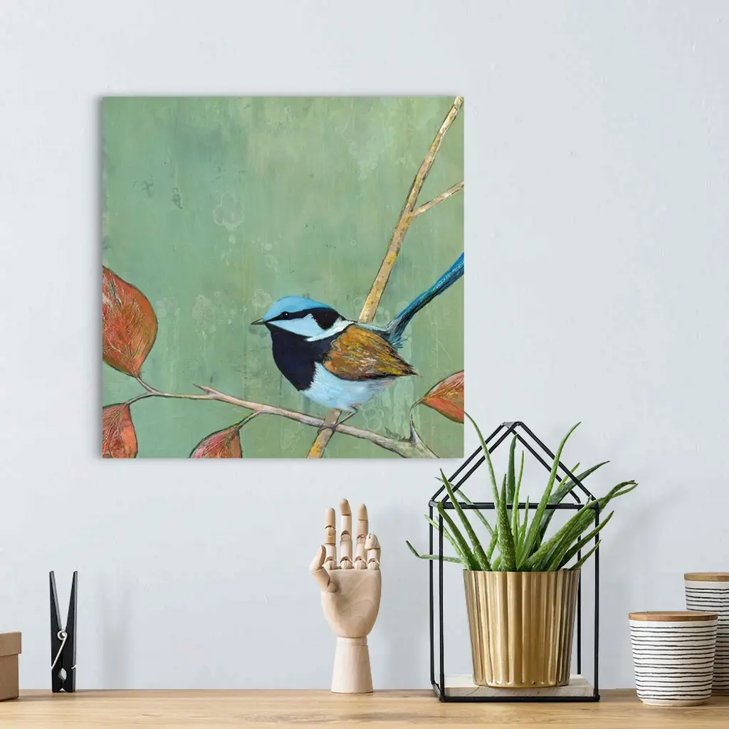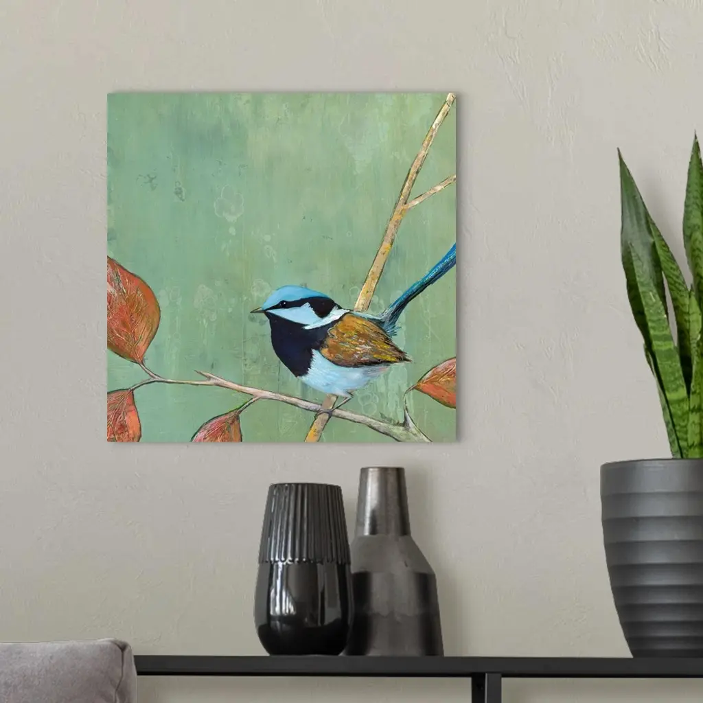 A painting of a garden bird perched on a branch with fall leaves, against a green background.