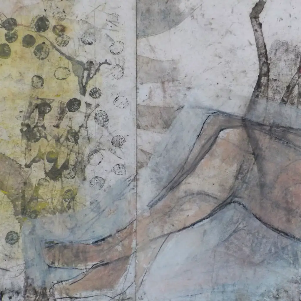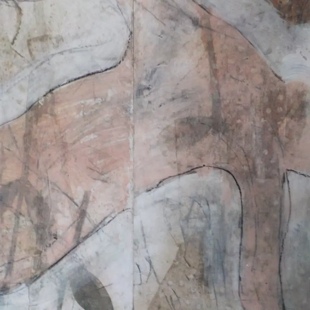 Timeless and sublime, this artwork belongs to a series of large-format paintings that revisit the works of ancient Renaissance and Baroque masters from Italy. Depicting details of Caravaggio's 'The Raising of Lazarus' in a contemporary style, it is deftly handmade on paper using a mixed technique whereby iron stencils are pressed to create human or nature-inspired figures, which are then filled with alcohol-based colors and pigments.