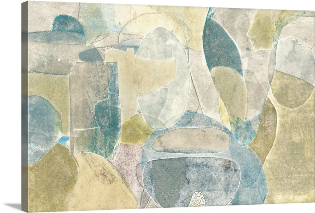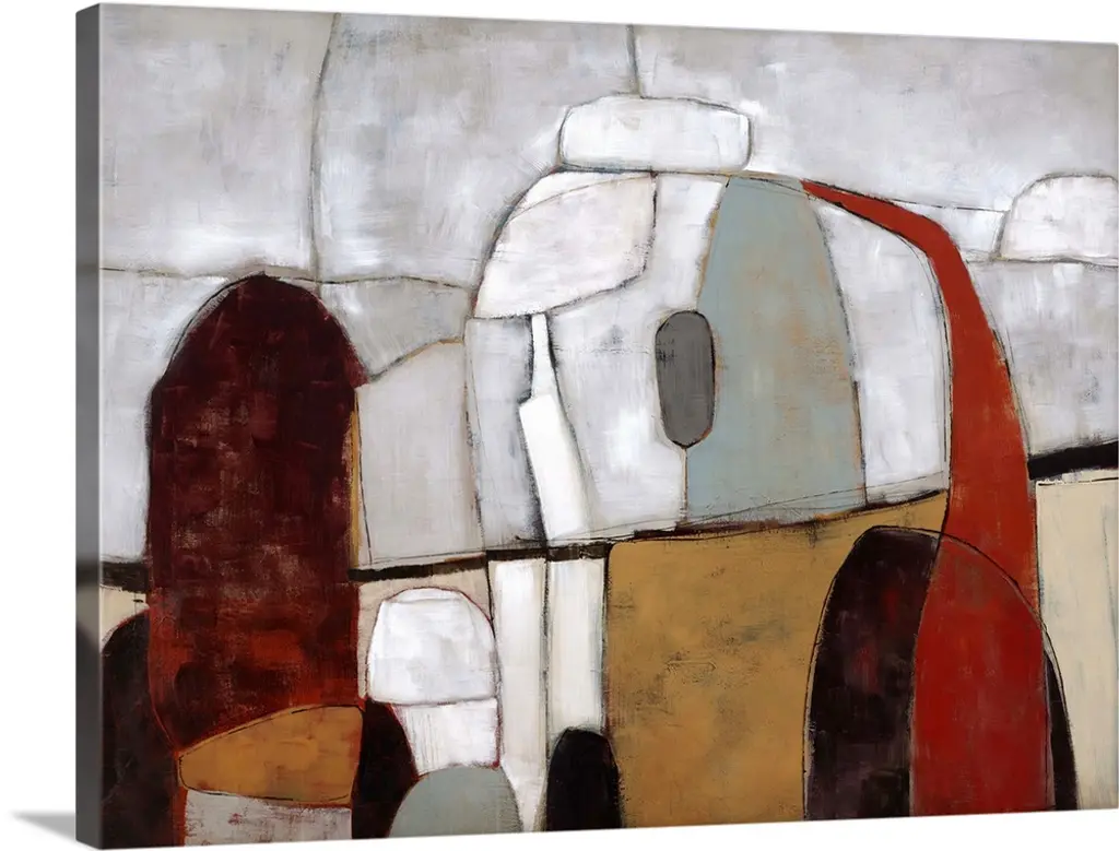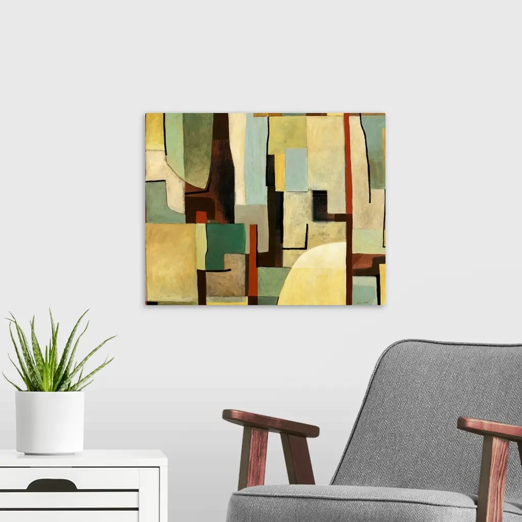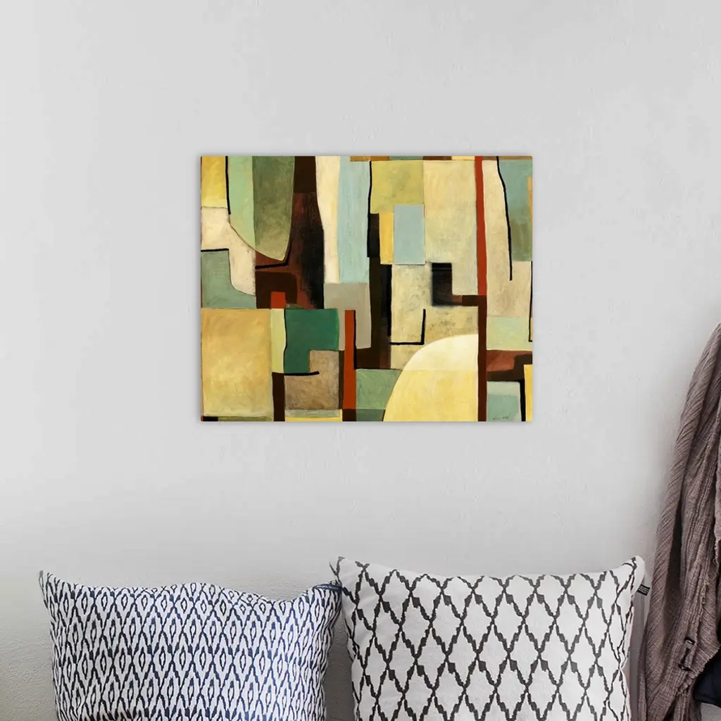 Contemporary abstract painting warm and cool tones in geometric shapes.