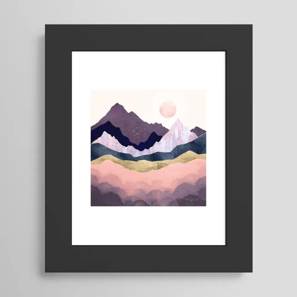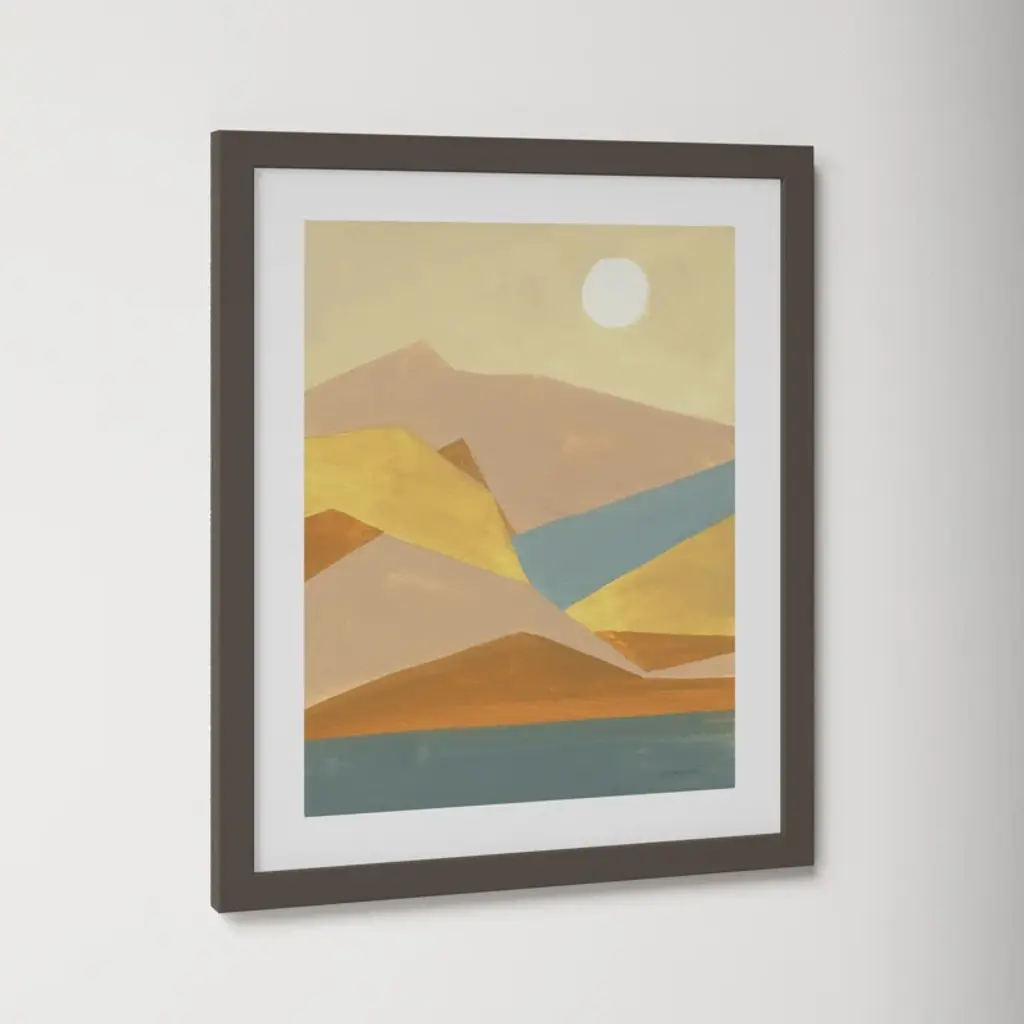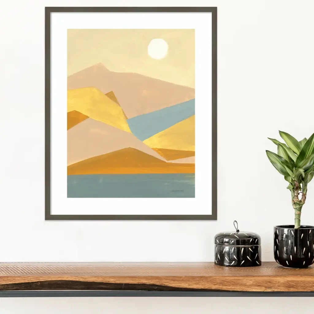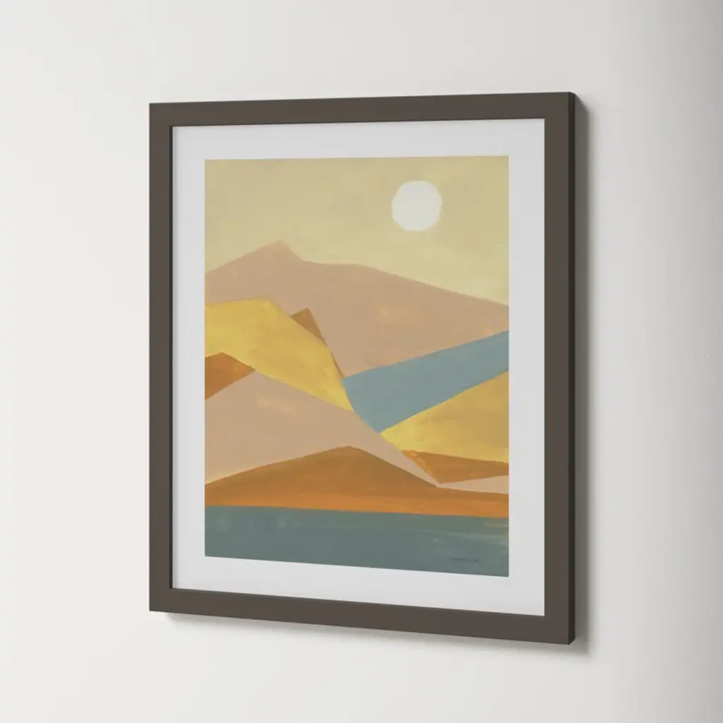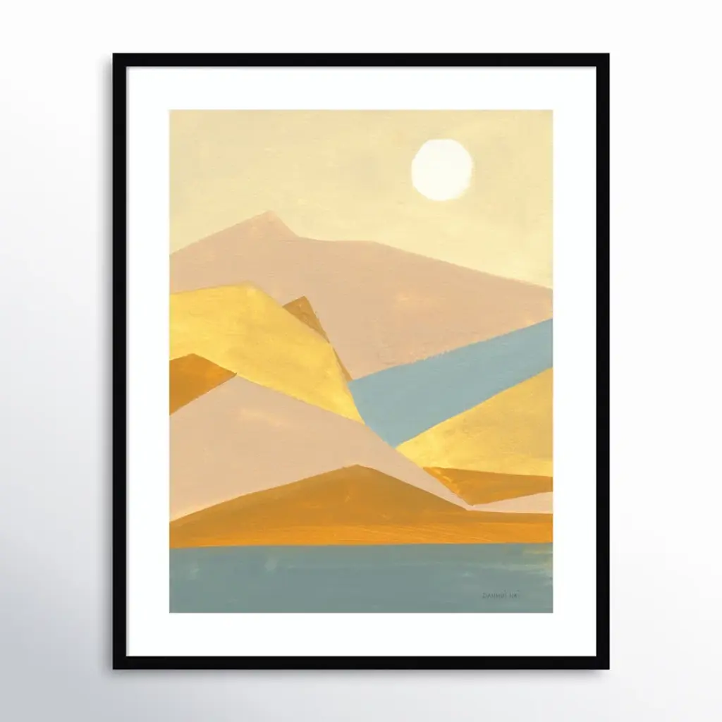 Warm tones and a bold geometric design create a scaled-back impression of a desert scene in this abstract painting print. Printed in the USA, this piece by artist Danhui Nai features a composition with layered triangular shapes in blue, tan, and yellow to create the look of sand dunes and mountains. This piece is giclee-printed on paper using archival inks for an accurate reproduction. It arrives framed and covered with acrylic glass that helps protect the image from fading. A wall hanging wire is attached, and mounting hardware is included.