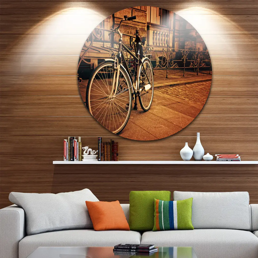 Bring Contemporary Abstraction to your home with this large Circle Metal wall art. This Retro Bicycle against Stone Wall Metal Artwork makes it the focal point of any room or office. - White Gloss Coating ensures colors are extra vibrant with light reflection.- Aluminum grade Sheet Metal with 1 inch mounting frame on the back giving the illusion that the artwork is floating on the wall..- Mounting Brackets are included along with instructions.- High Quality Digital images are created directly into a glossy aluminum panel producing a stunning and captivating print into the glossy finish of the metal.- Water, Fire and Scratch resistant HD Aluminum panels.- Looks better than any photo paper and guaranteed to last at least 20 years- Easy to clean with a microfiber cloth. Colors are far superior to regular Canvas Art. - Easy to Hang