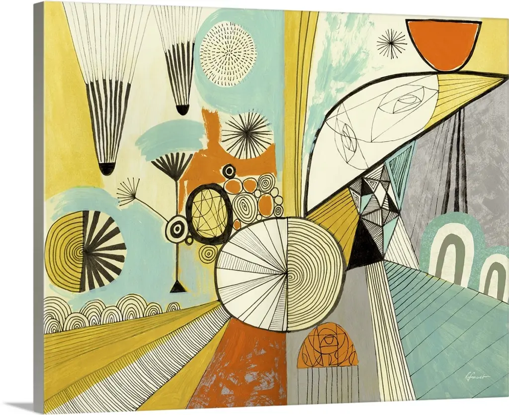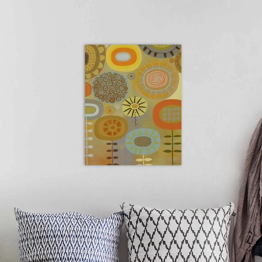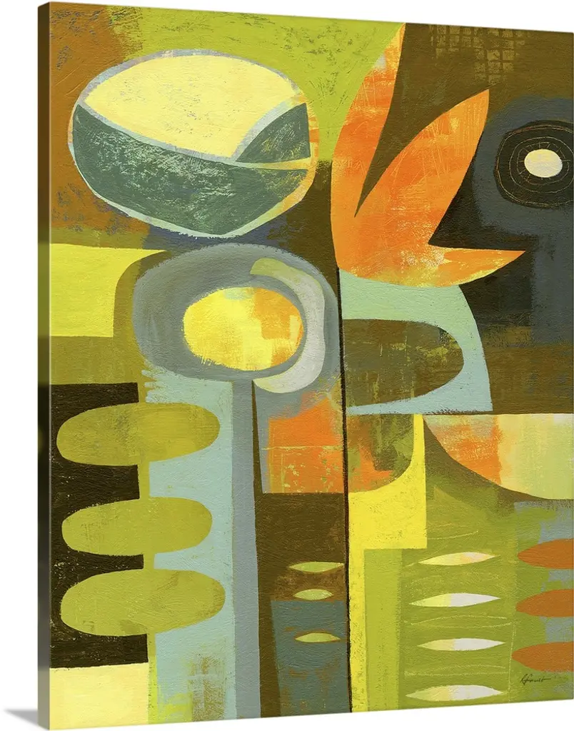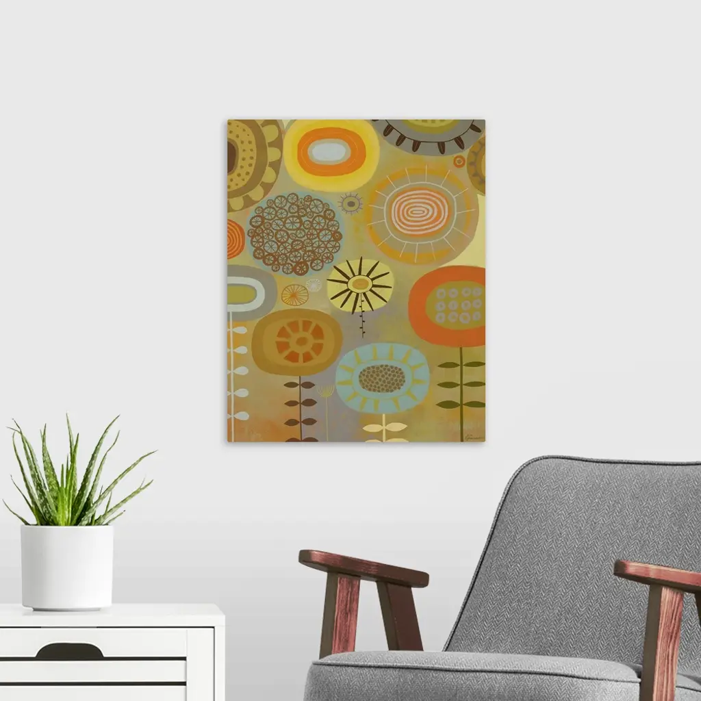 Contemporary painting with a retro feel of colorful shapes and designs making a flowery garden scene.