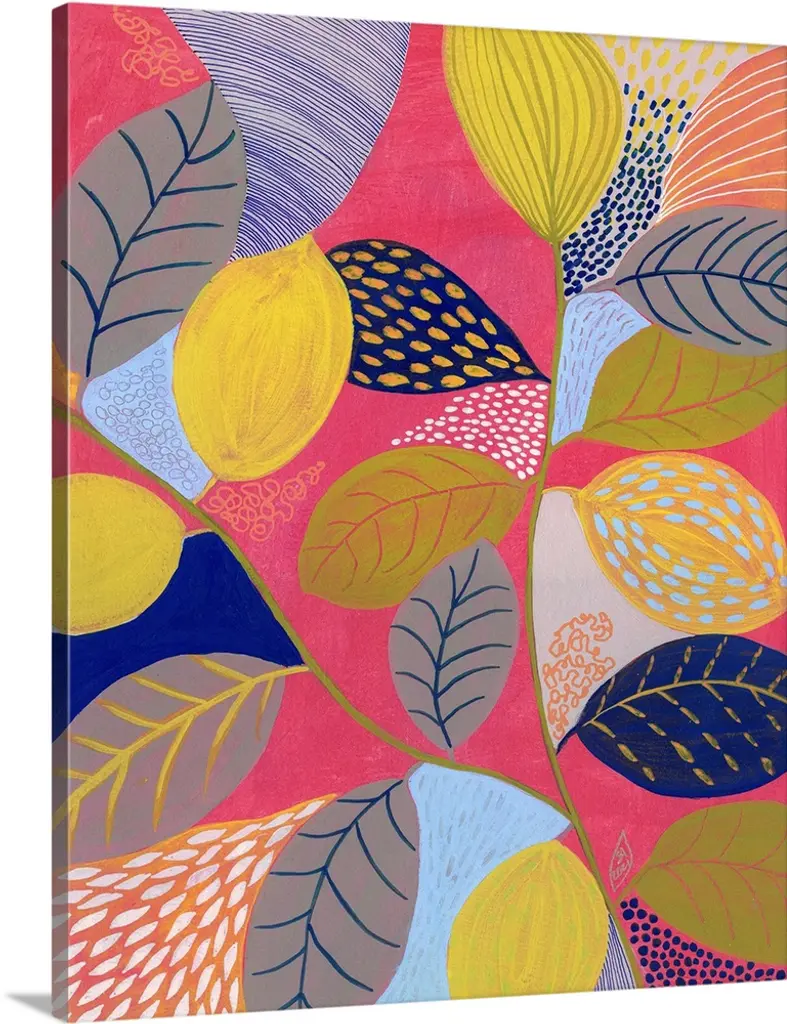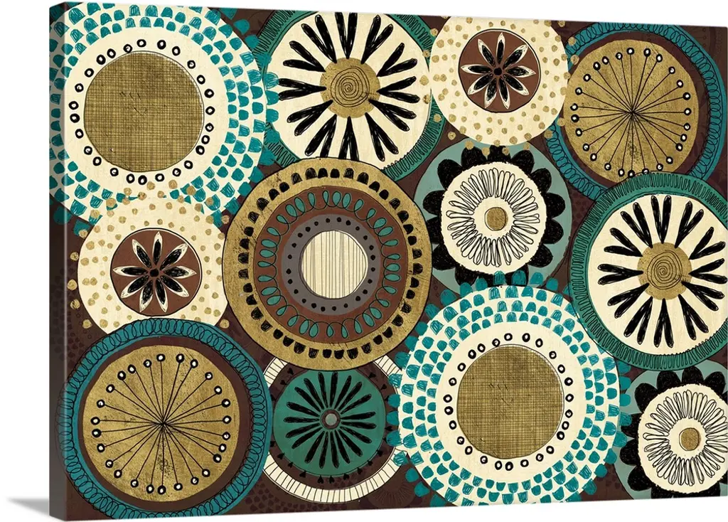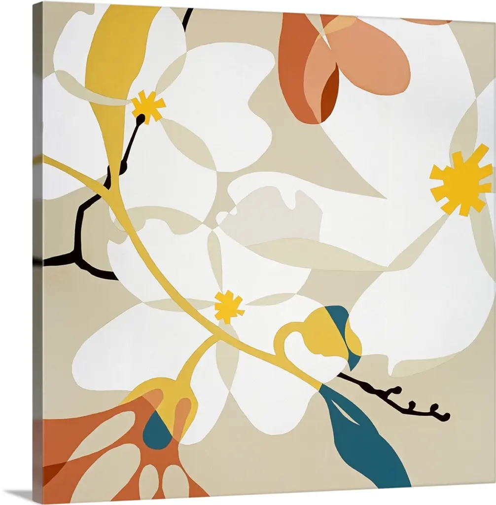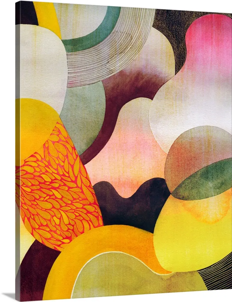 Contemporary painting with a retro feel of colorful shapes and designs making a flowery garden scene.