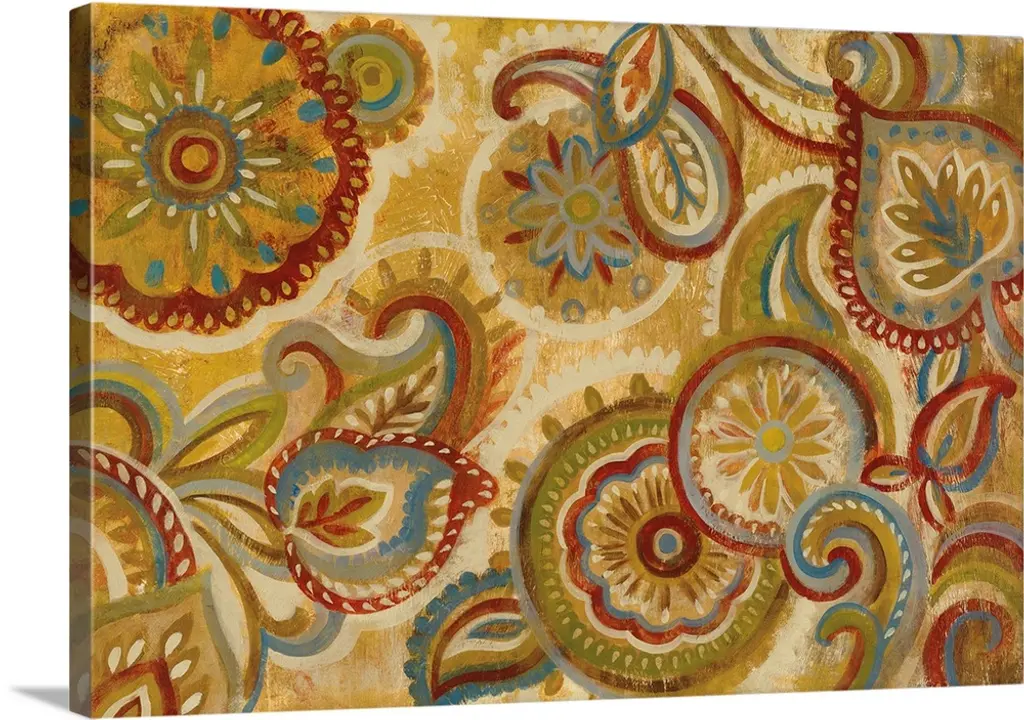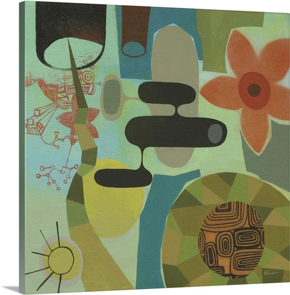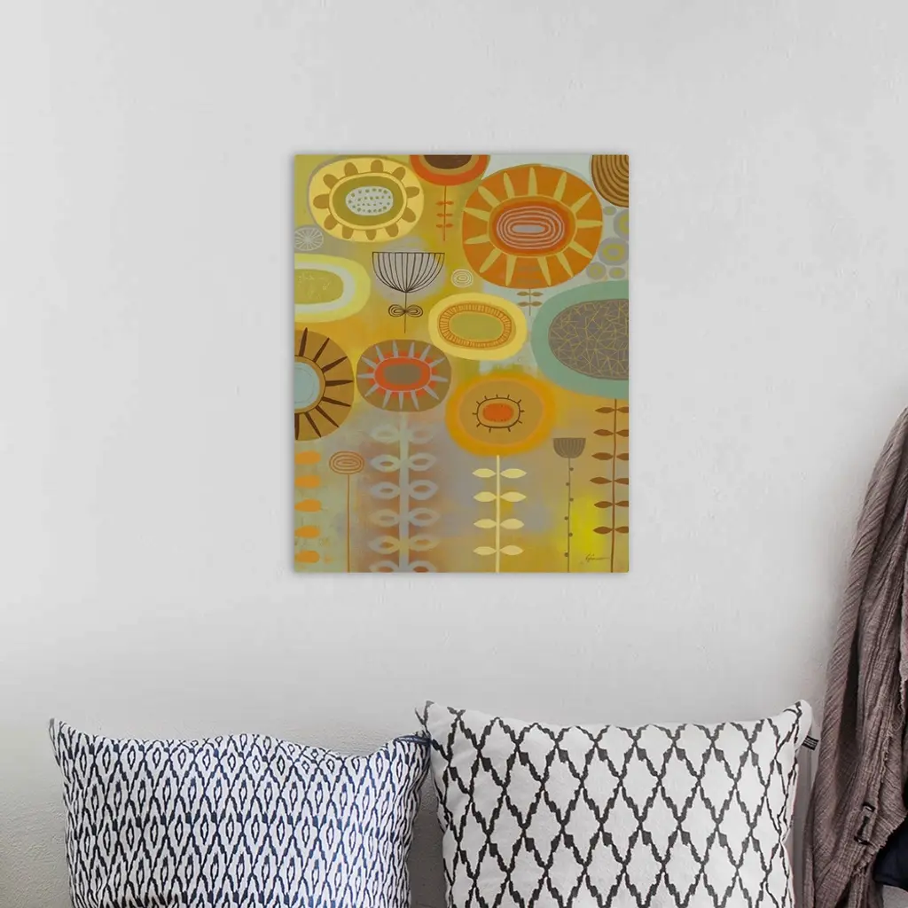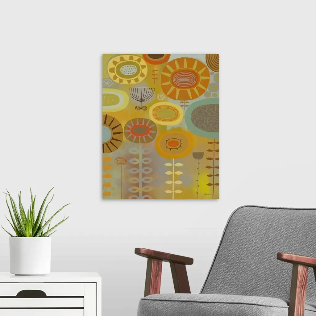 Contemporary painting with a retro feel of colorful shapes and designs making a flowery garden scene.