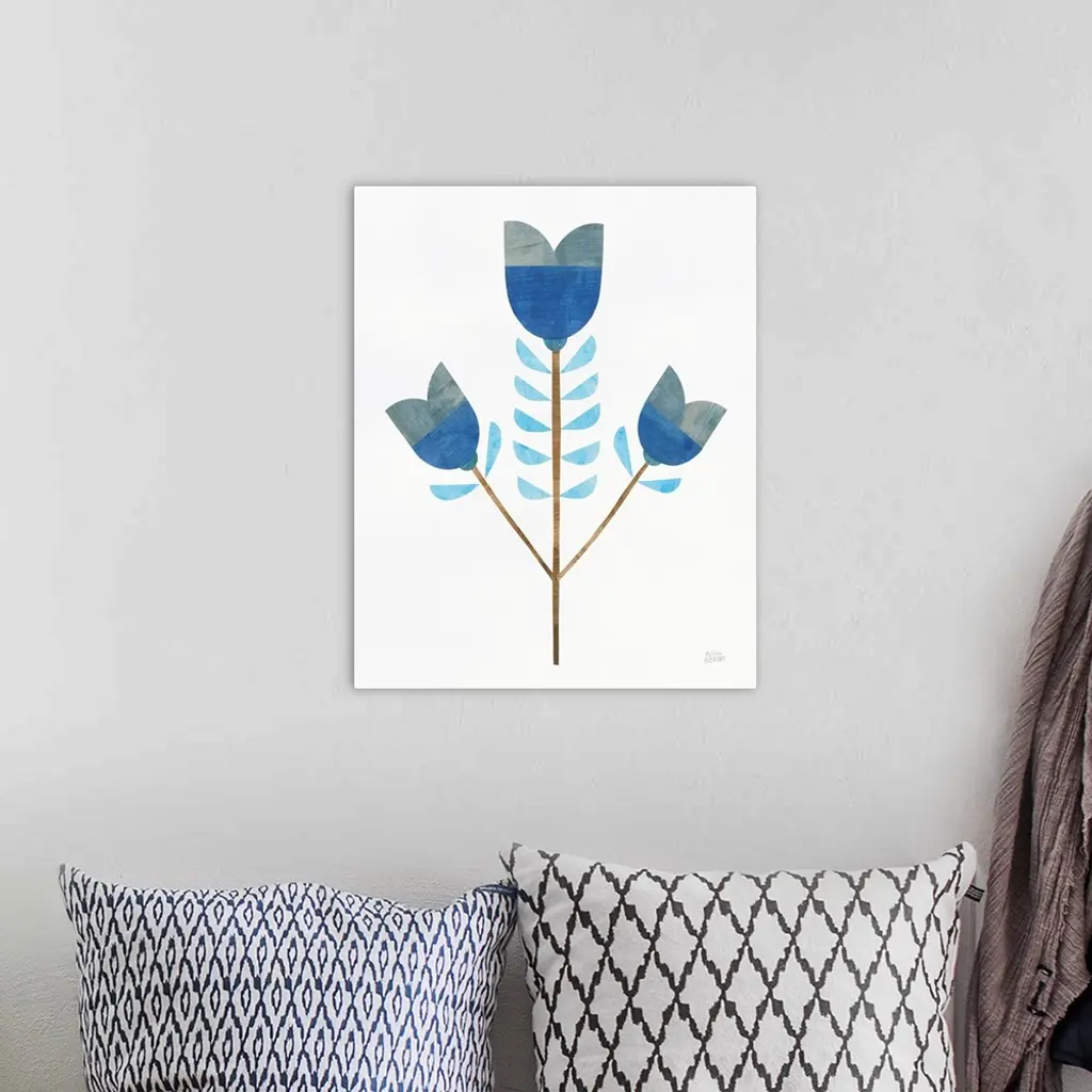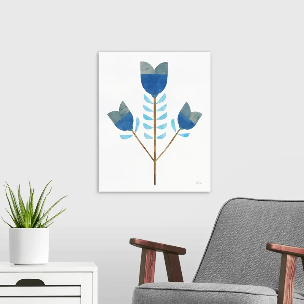 Contemporary artwork of blue flowers created with individual cut out pieces of painted paper and put on a white background.