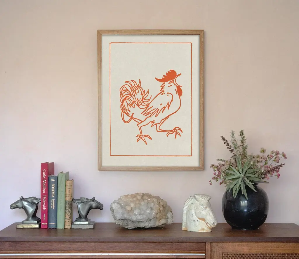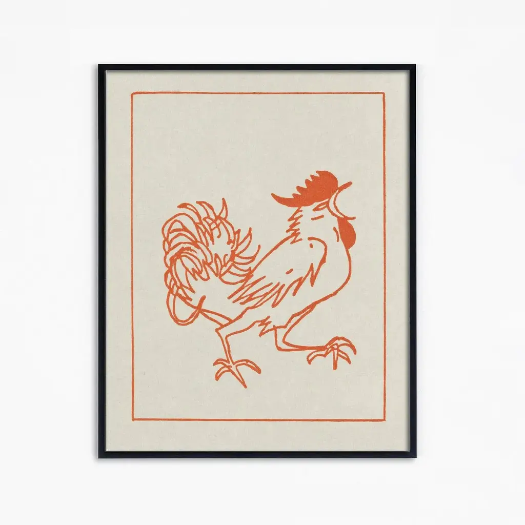 This vintage chicken/rooster print is minimal and fun for the chicken lovers. A great retro piece for a kitchen or farmhouse. Archival print on 290gsm fine art paper. Prints ship out in 1-3 days, Chairish estimated times are not correct.