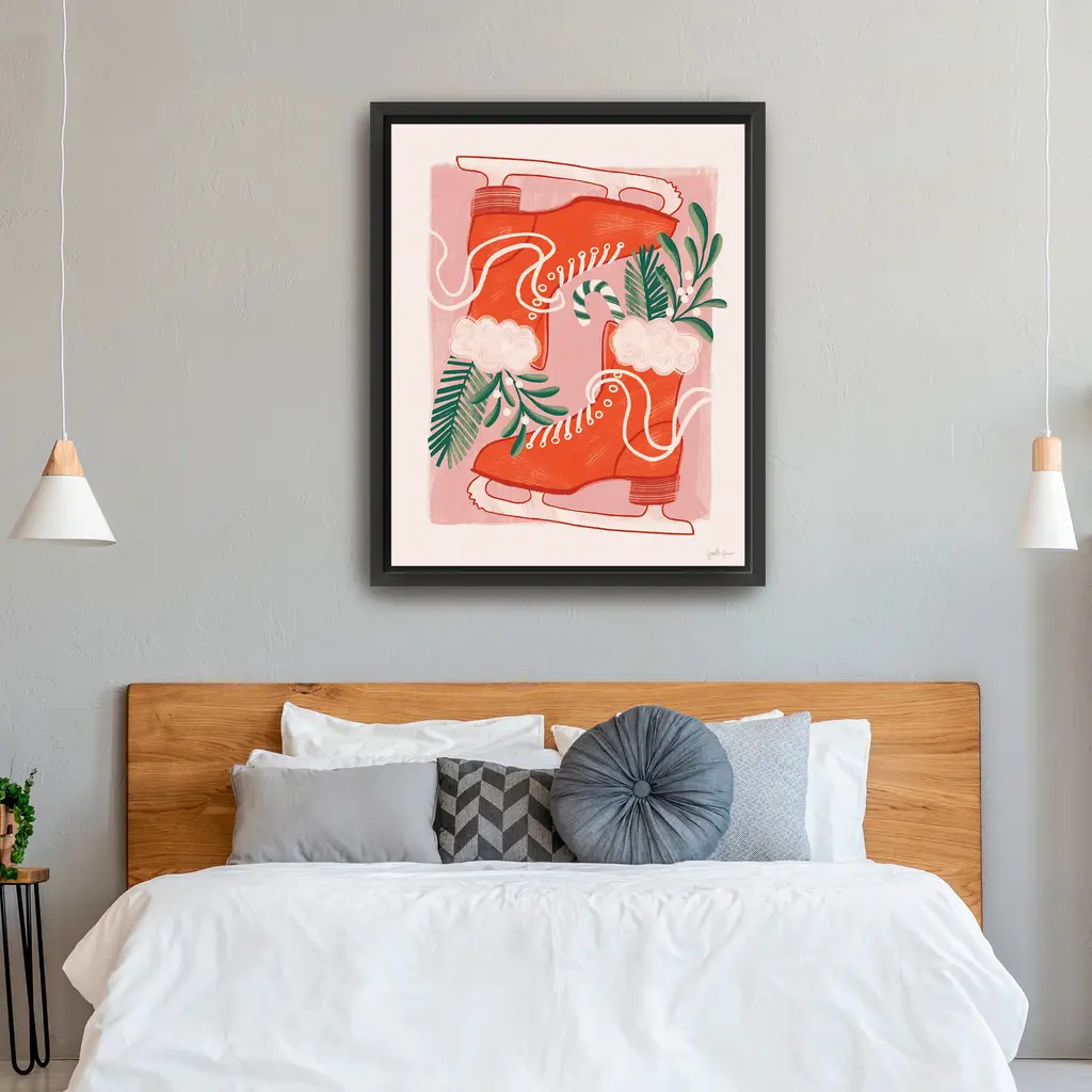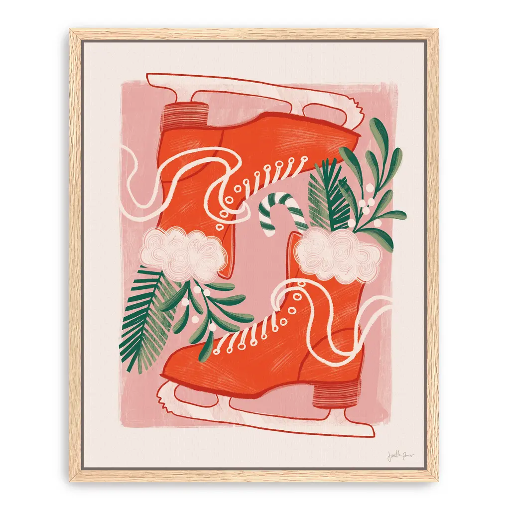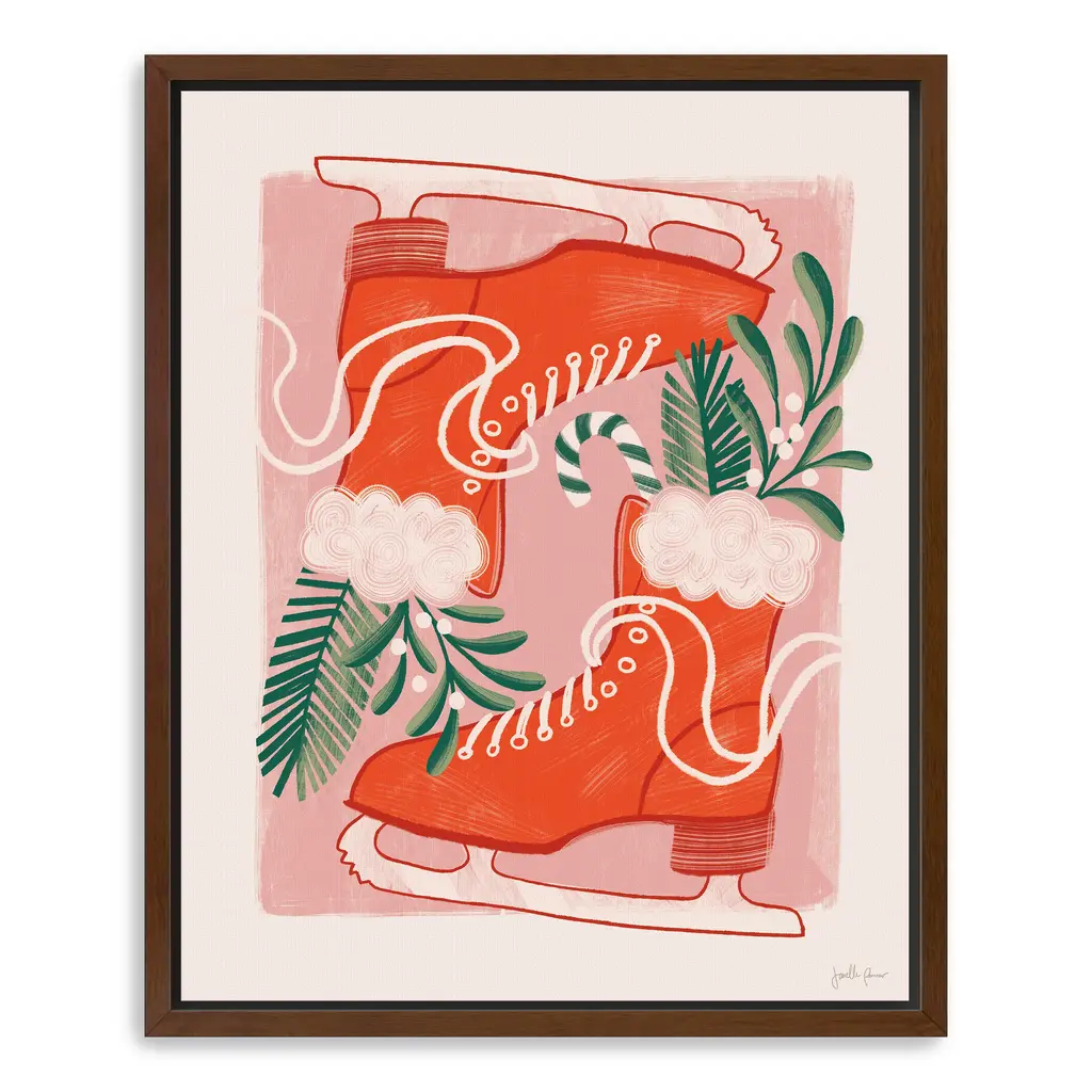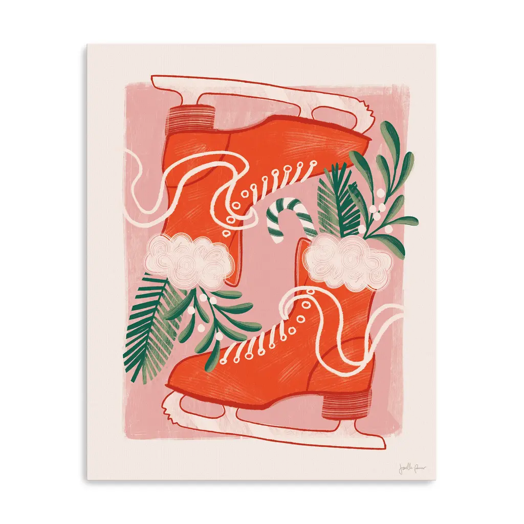 Celebrate the joy of winter with this festive canvas print featuring red ice skates trimmed in white and surrounded by holiday greenery. The soft pink background and swirling ribbon details evoke warmth, movement, and seasonal cheer. Our Gallery Wrap Canvas Prints are proudly assembled with high quality materials in California, USA. Each piece is printed on a thick, archival grade canvas using Giclee technology. It is then hand-stretched by our experienced artisans over solid wood bars, which will not warp over time. The final product is a piece personally crafted for you to confidently display on your wall. Care and Assembly: Ensure that the location of your piece has little to no exposure to heat, sunlight, and moisture. Wipe clean, only if needed. Each piece includes hanging hardware to hang on your wall vertically.