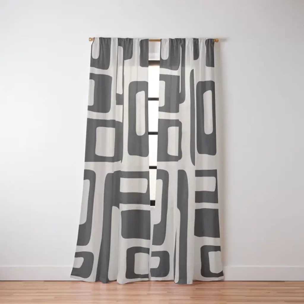 Retro Mid Century Modern Abstract Pattern 735 Black And Linen White Curtain