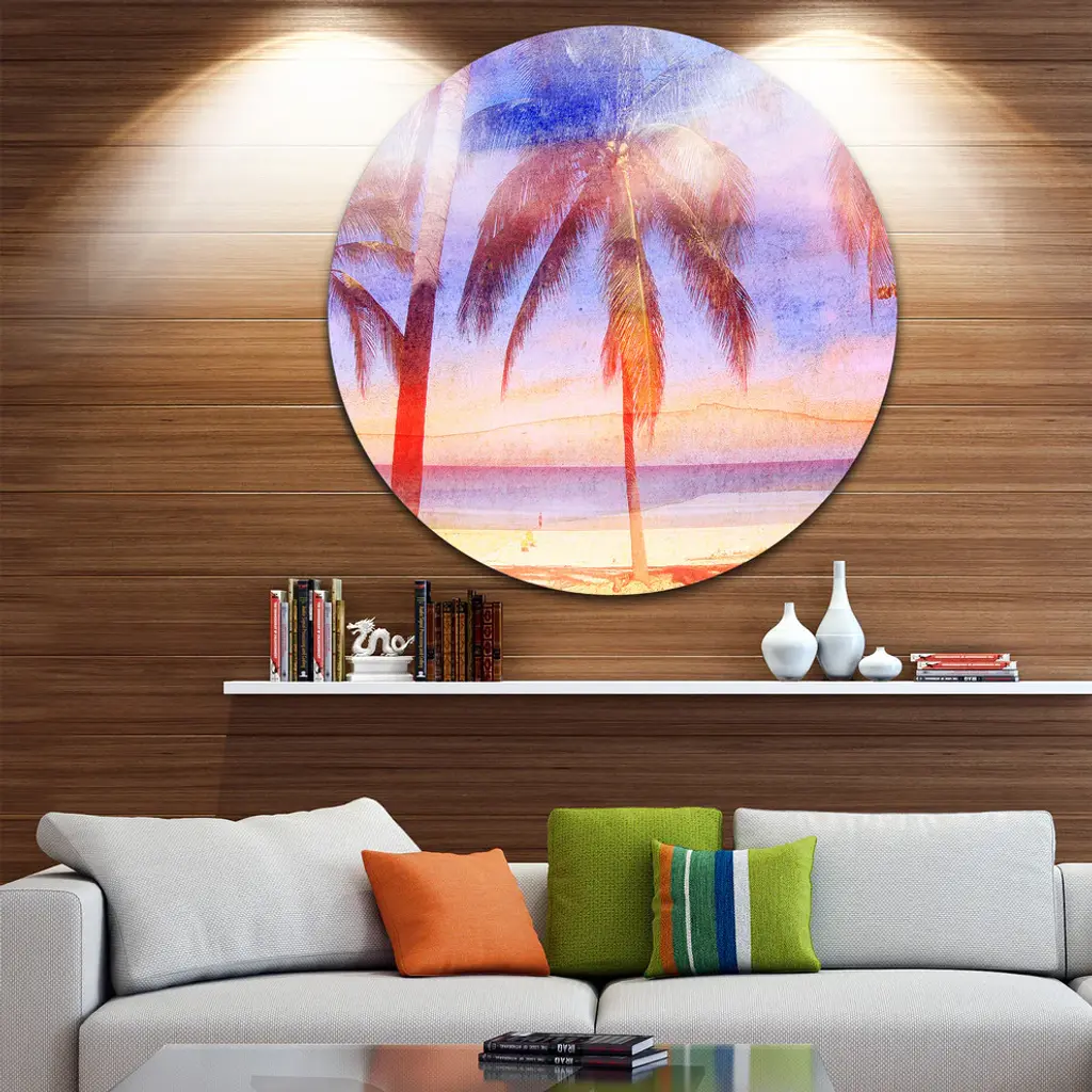 Bring Contemporary Abstraction to your home with this large Circle Metal wall art. This Retro Palms Light Blue Watercolor Metal Artwork makes it the focal point of any room or office. - White Gloss Coating ensures colors are extra vibrant with light reflection.- Aluminum grade Sheet Metal with 1 inch mounting frame on the back giving the illusion that the artwork is floating on the wall..- Mounting Brackets are included along with instructions.- High Quality Digital images are created directly into a glossy aluminum panel producing a stunning and captivating print into the glossy finish of the metal.- Water, Fire and Scratch resistant HD Aluminum panels.- Looks better than any photo paper and guaranteed to last at least 20 years- Easy to clean with a microfiber cloth. Colors are far superior to regular Canvas Art. - Easy to Hang