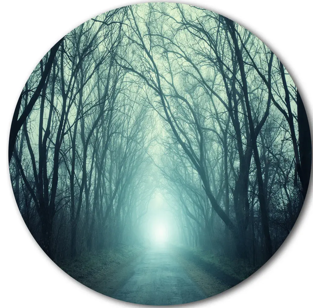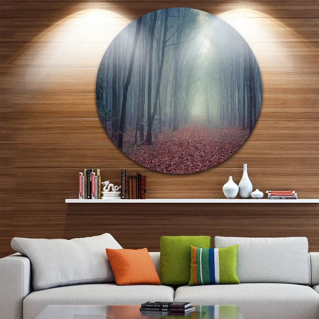 Bring Contemporary Abstraction to your home with this large Circle Metal wall art. This Retro Style Misty Path in Forest Metal Artwork makes it the focal point of any room or office. - White Gloss Coating ensures colors are extra vibrant with light reflection.- Aluminum grade Sheet Metal with 1 inch mounting frame on the back giving the illusion that the artwork is floating on the wall..- Mounting Brackets are included along with instructions.- High Quality Digital images are created directly into a glossy aluminum panel producing a stunning and captivating print into the glossy finish of the metal.- Water, Fire and Scratch resistant HD Aluminum panels.- Looks better than any photo paper and guaranteed to last at least 20 years- Easy to clean with a microfiber cloth. Colors are far superior to regular Canvas Art. - Easy to Hang