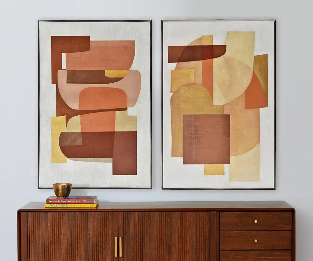 Reinforce your mid-century aesthetic with the Retro Sunset Oil Painting II. This piece takes the classic autumnal hues of goldenrod, terracotta, mustard and burnt orange and layers them in striking fashion. This geometric homage to cubism features the same clean, curving lines so often found in mid-century furniture, thus making this piece an ideal way to cement this classic style in your home. Add this oil painting to any room and enjoy the way the vivid hues bring a sense of warmth to your space. This painting is sold as an individual unit. All other works of art shown with this piece are sold separately.