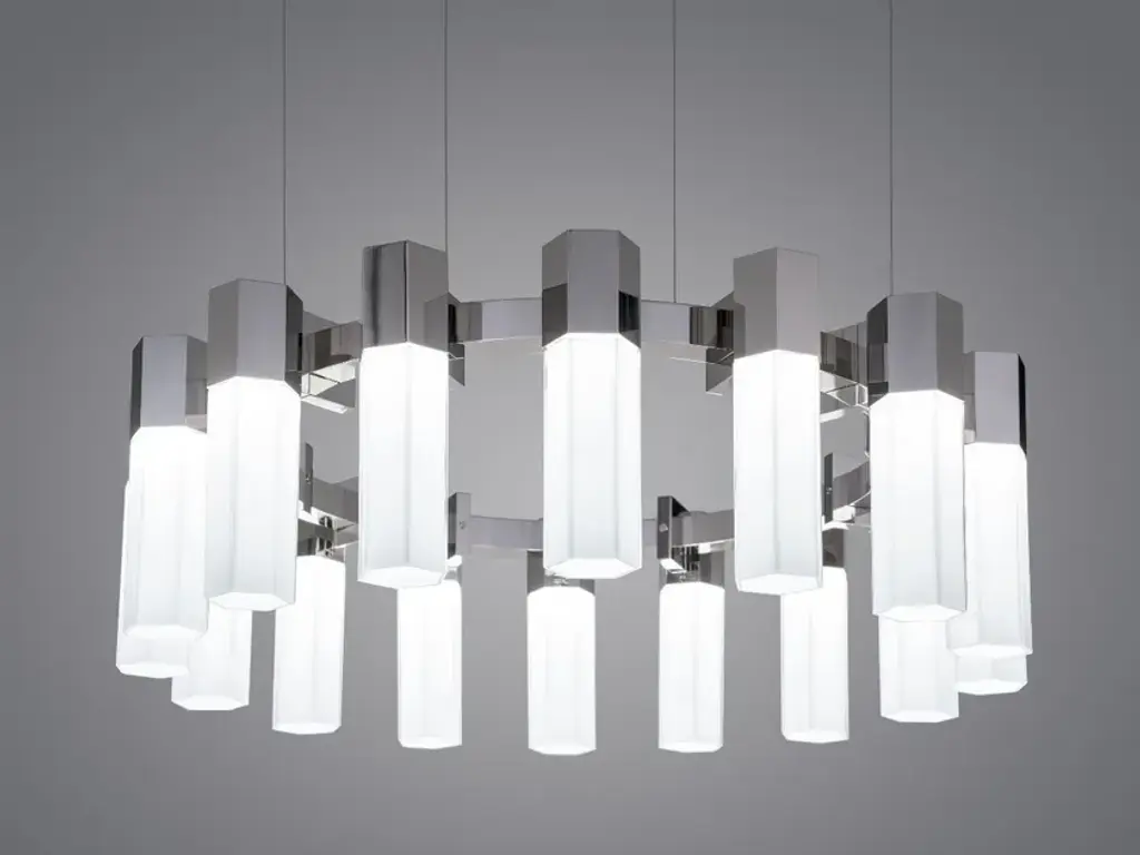 Brilliant illumination is revealed through the gentle waves of clear acrylic rods wrapping our Reveal Lighting Collection. Offering a one light sconce, three and four light vanity, three light semi flushmount, choice of nine or twelve light chandelier and mini-pendant, this contemporary collection can complete any space. Pair with the coordinating Reveal 28" fandelier, ideal for small spaces.