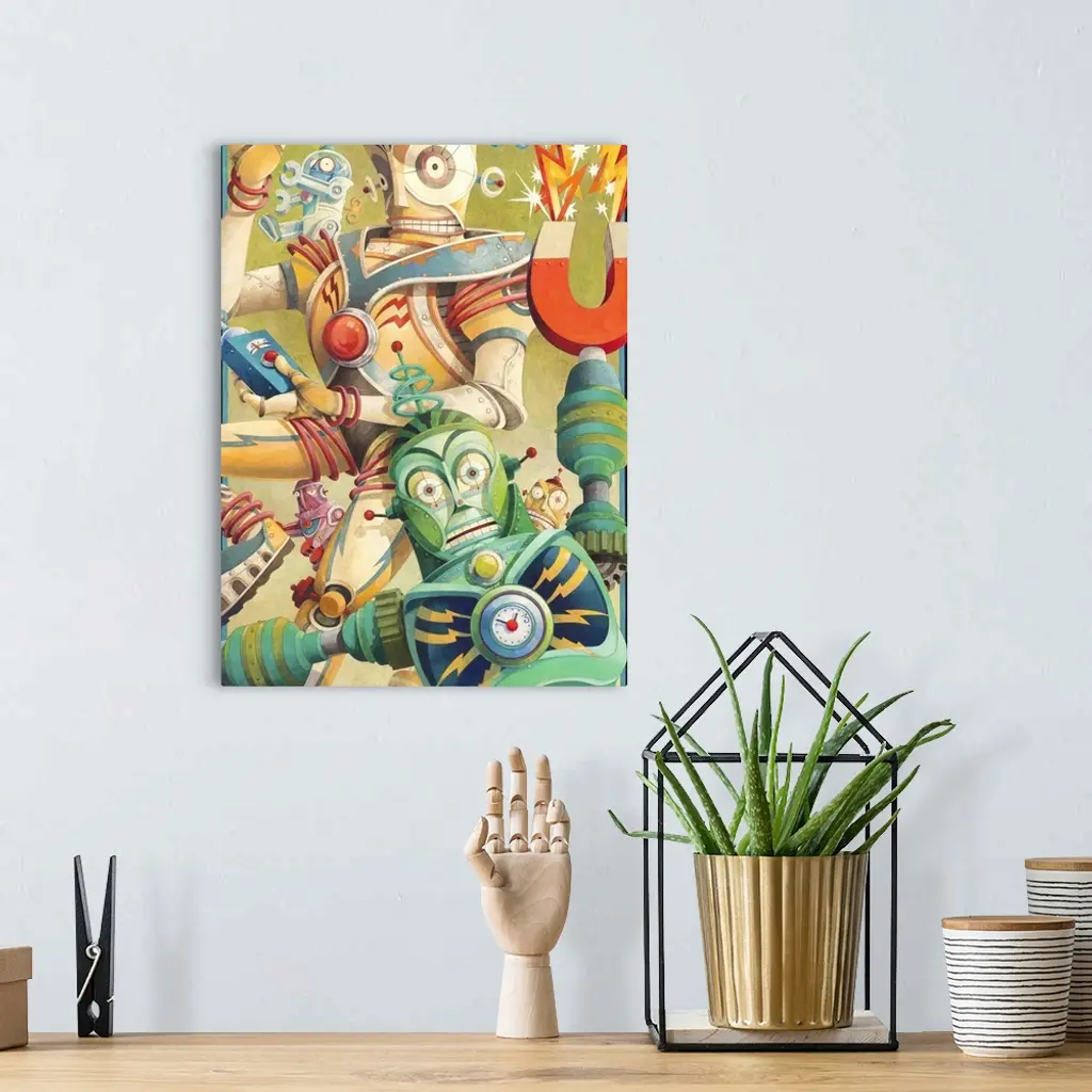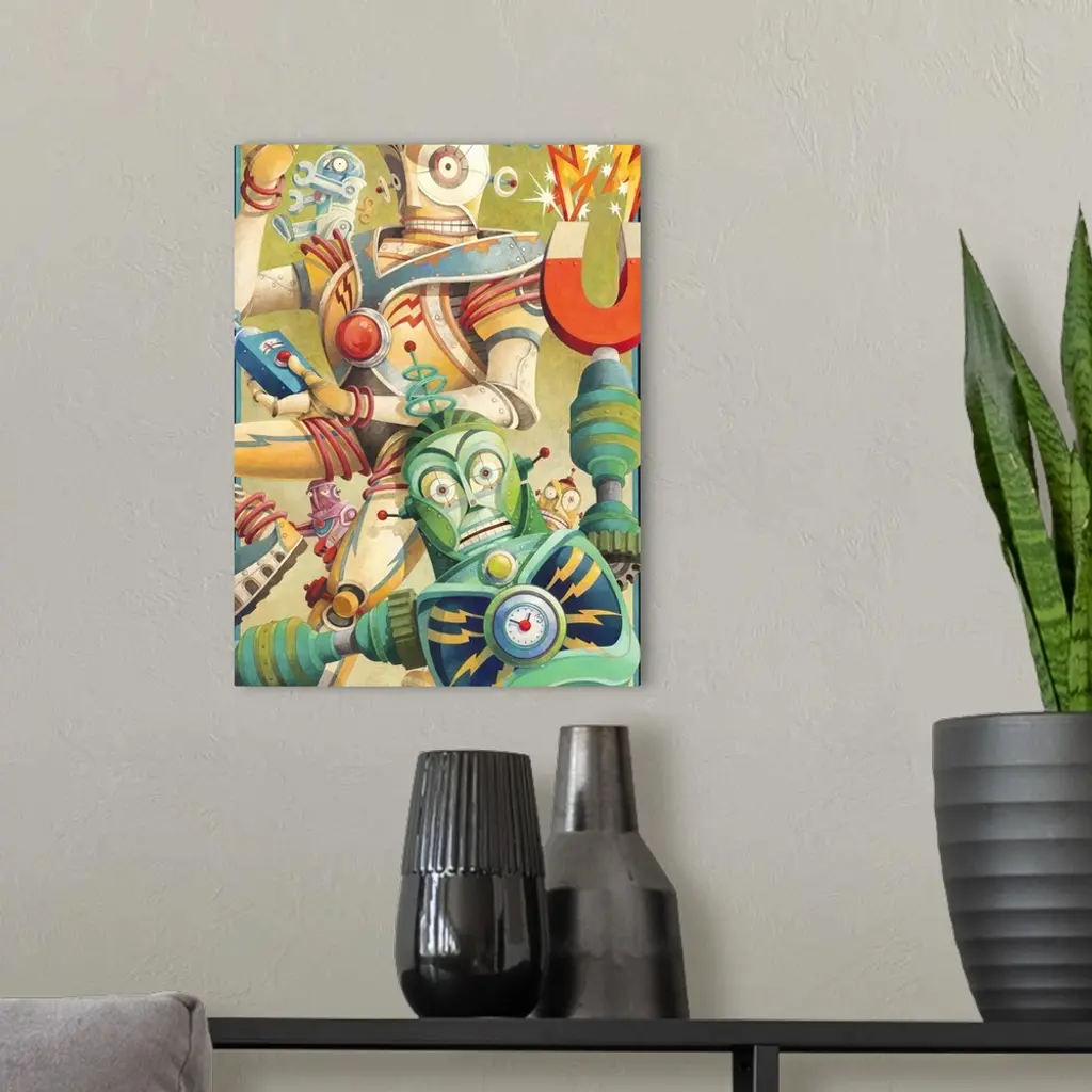 Contemporary artwork of elaborate and colorful looking robot characters.