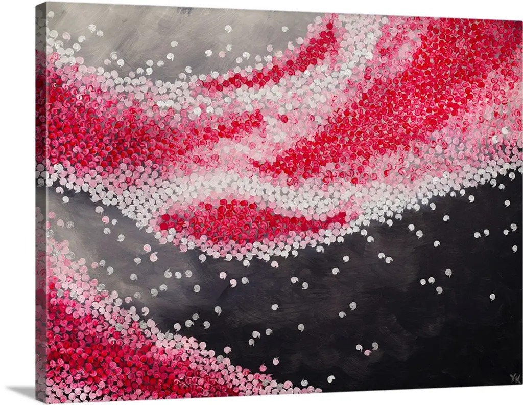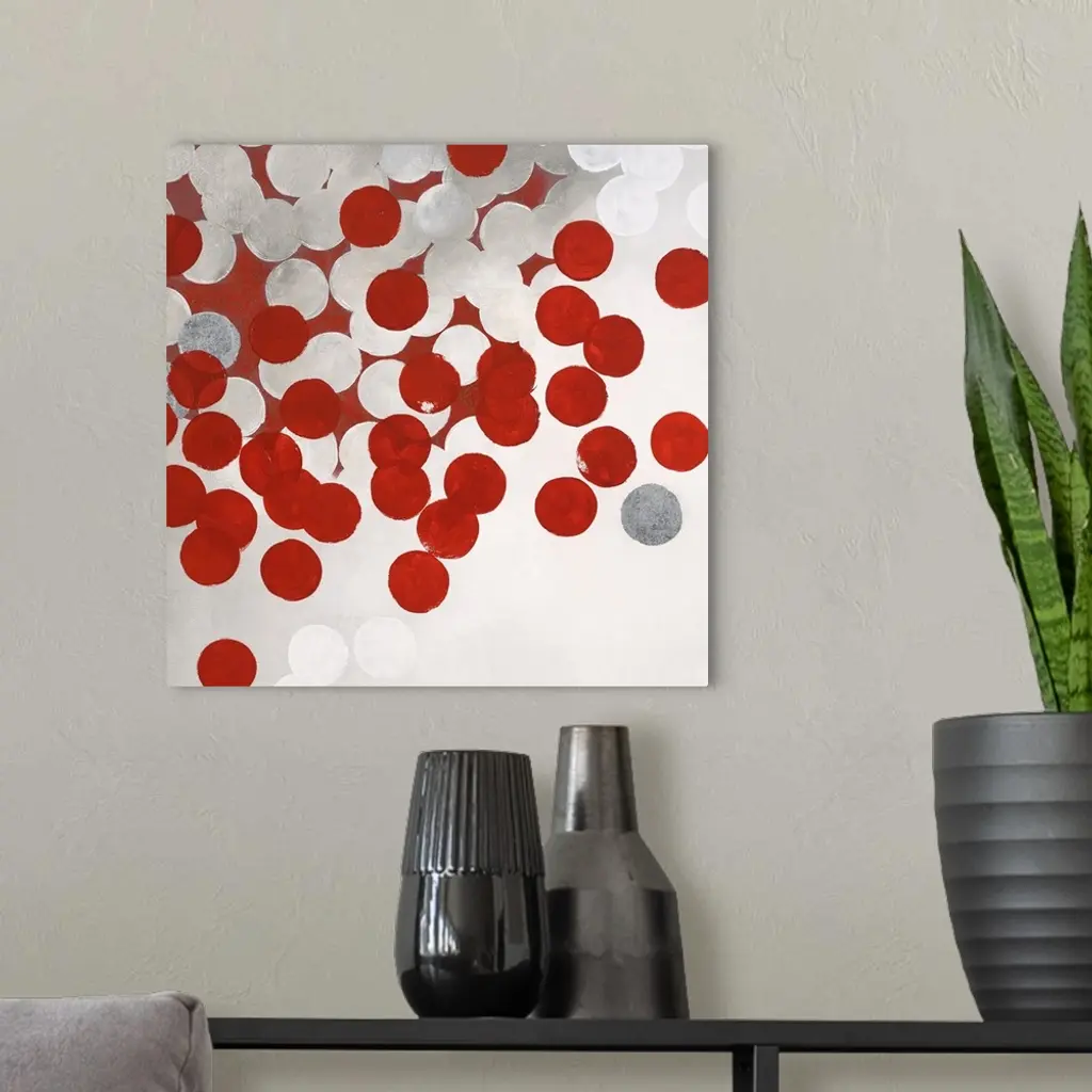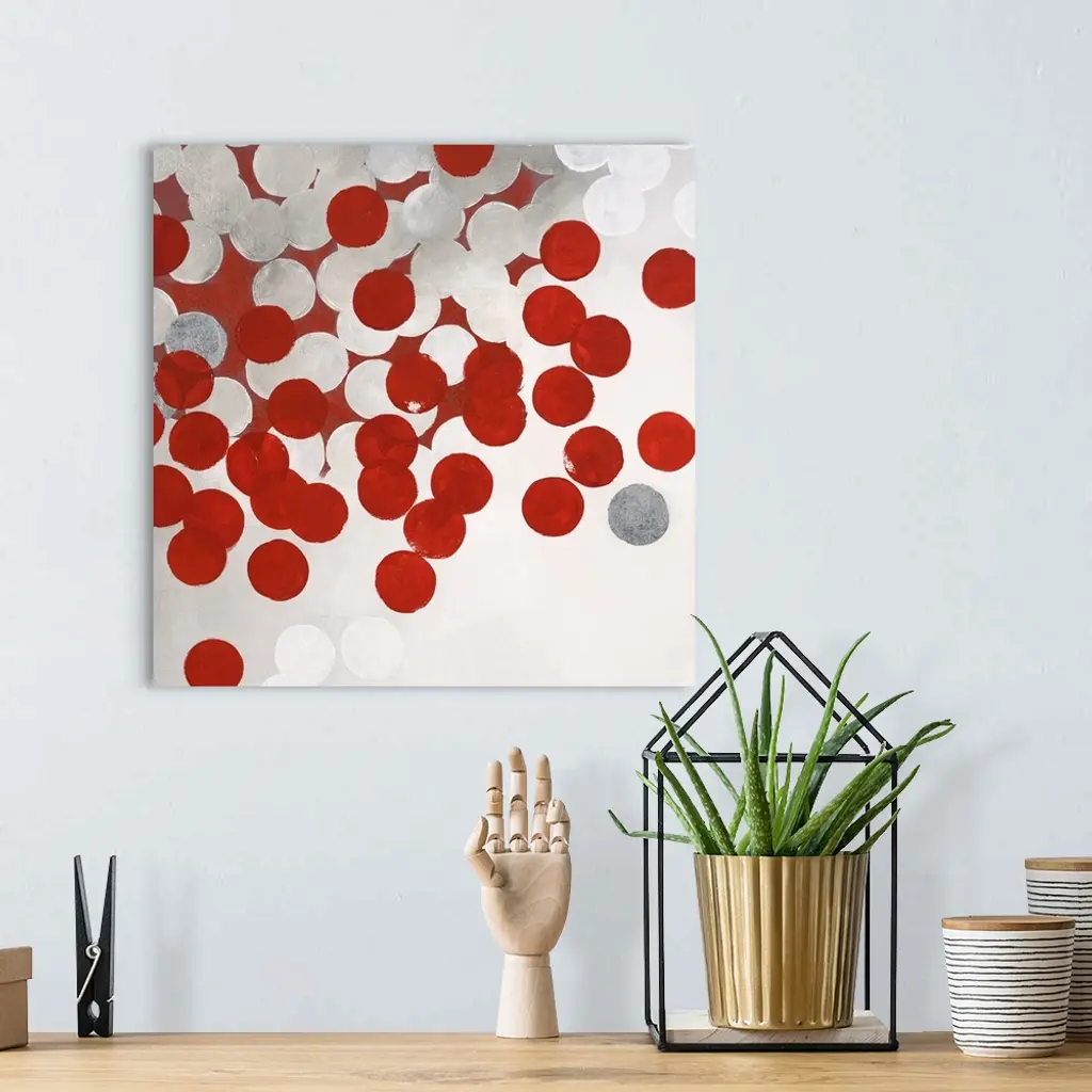 Contemporary abstract artwork made of white and red dots.