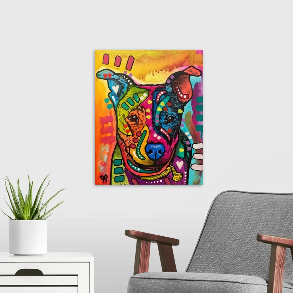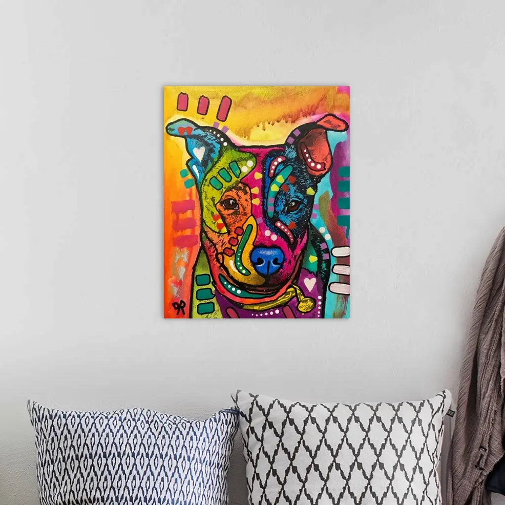 Contemporary stencil painting of a dog filled with various colors and patterns.