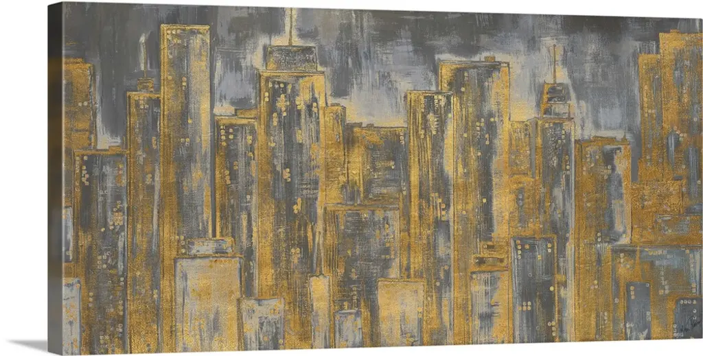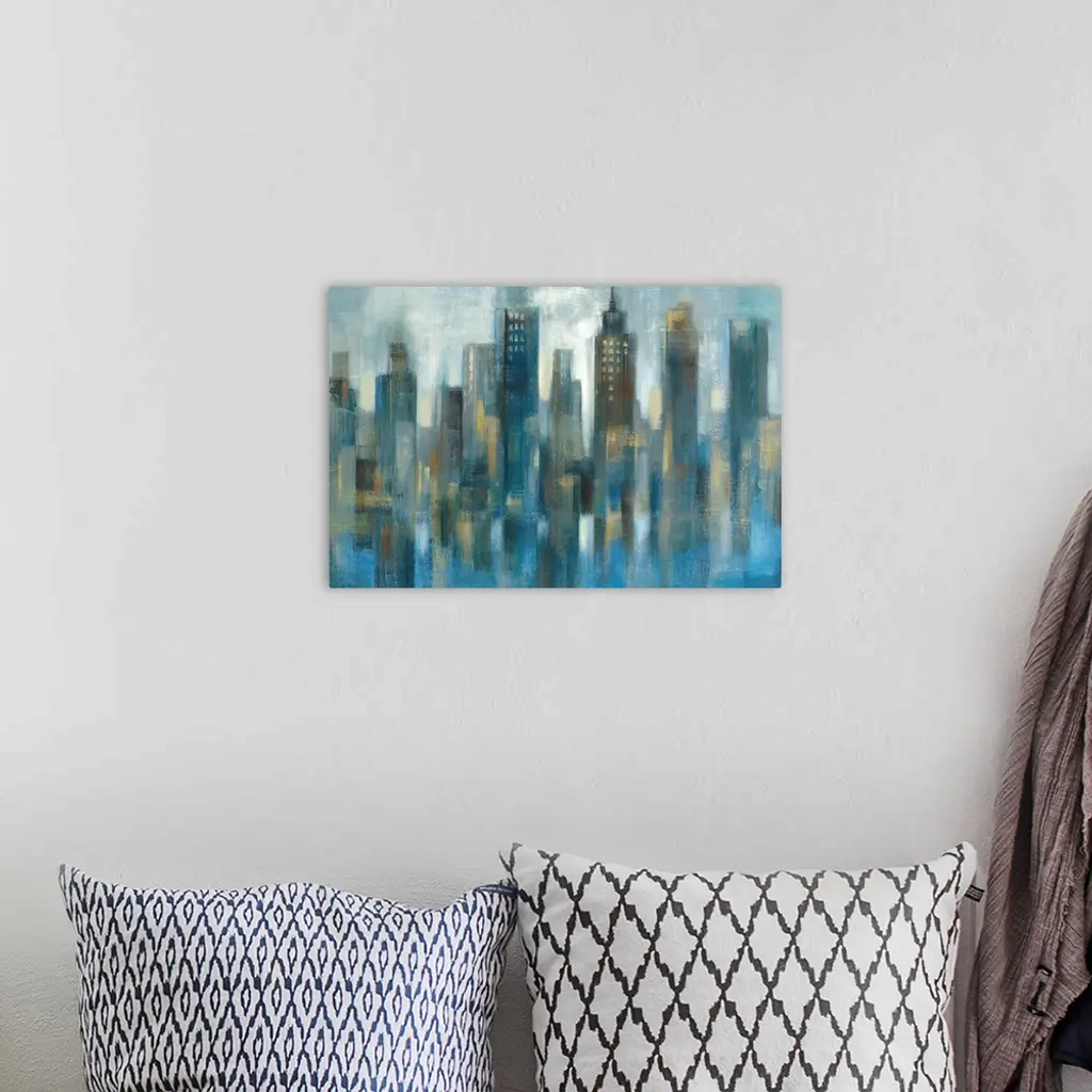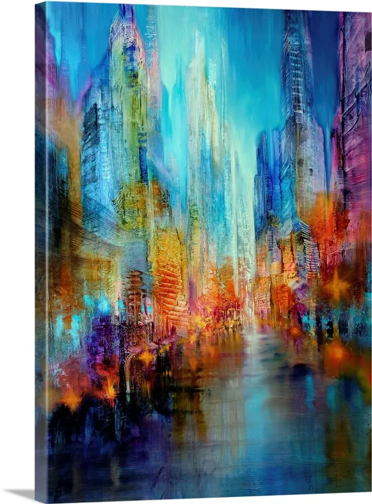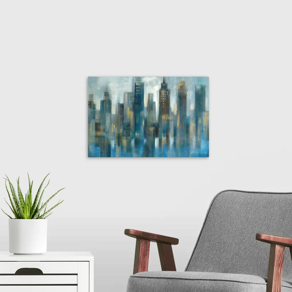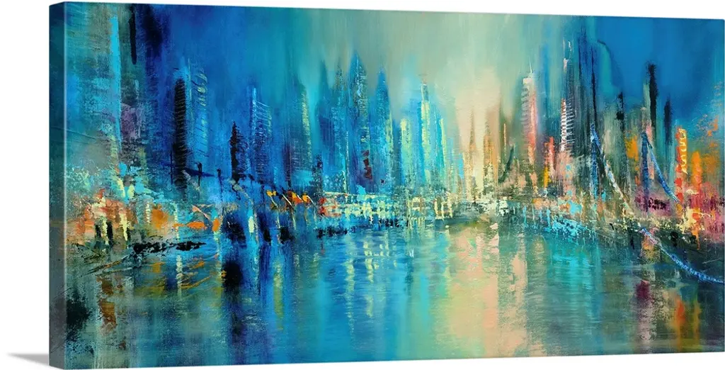 Large abstract painting of a cool toned city skyline with tall buildings at night.