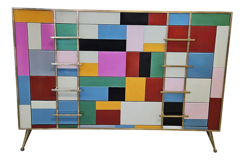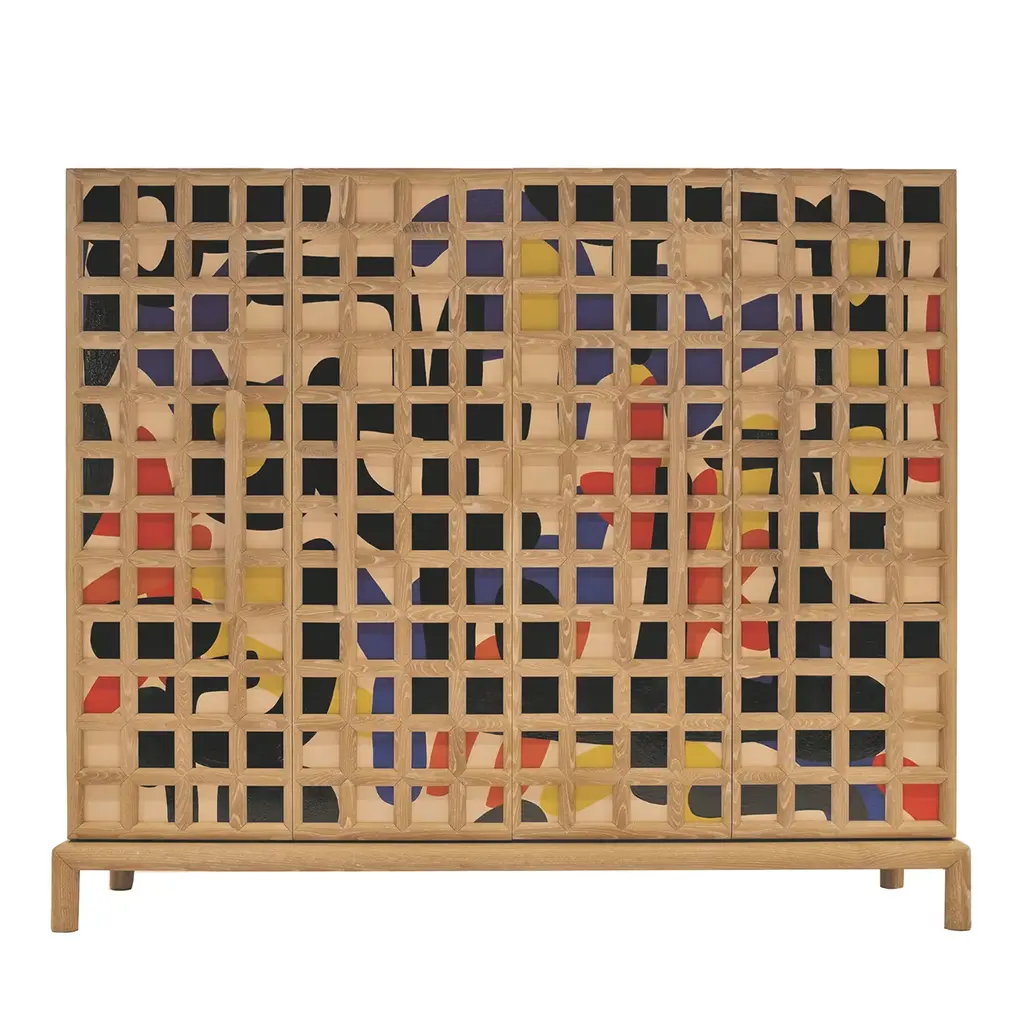 The Ribera sideboard uses traditional painting techniques, combined with highly sophisticated joinery to create an unexpected and surprising piece of furniture. Pickled oak is grafted in the form of a grid adapted for use as handles. The bi-fold hand-painted doors open to reveal an interior enhanced by the same wood and a division into compartments that makes the unit extremely versatile. Built-in lighting included. For customization, please ask the Concierge.