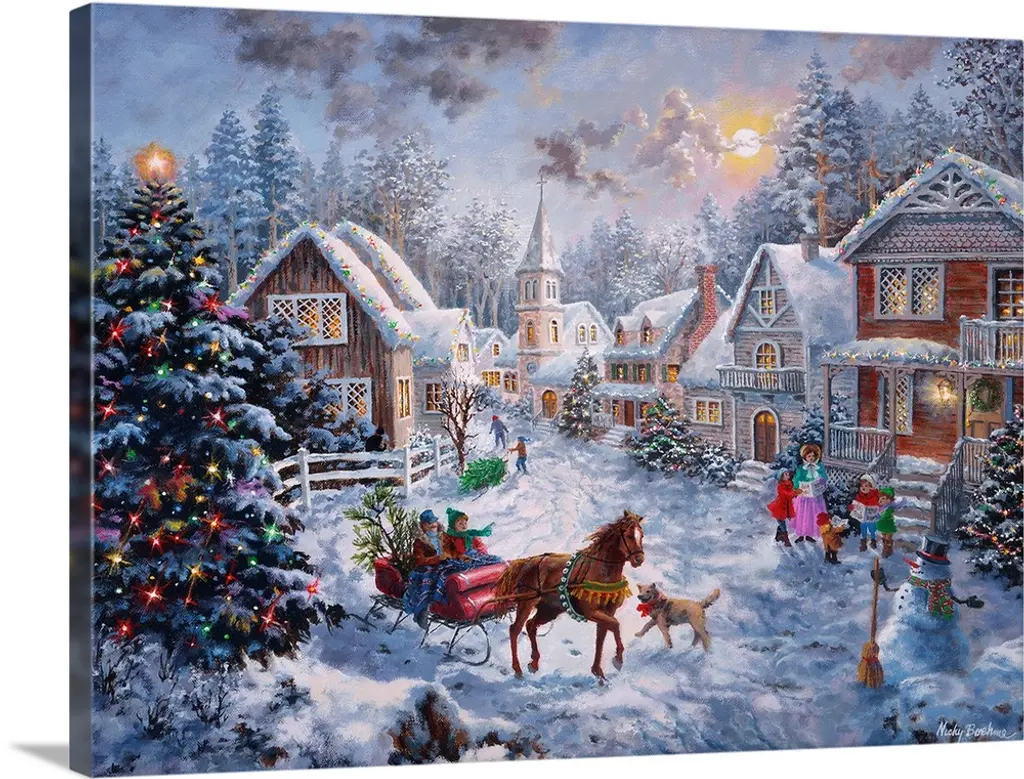 Bring the joy and warmth of the holiday season into your home with the Christmas Village canvas art by Richard Burns. This high-quality artwork features a beautiful winter village scene that will add a festive touch to any room. The finished size of this canvas art is 20" x 16", with a depth of 0.75". The entire image is protected by a UV coating, ensuring that it will stay vibrant for years to come. Hang it up immediately with no hardware required and enjoy the holiday season in style.Features: