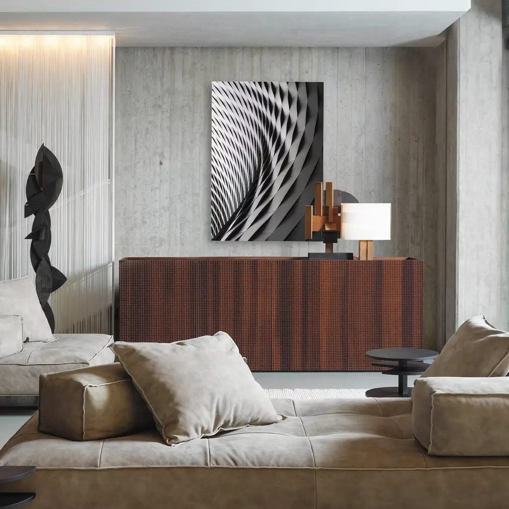 Mollica's intent in representing abstract geometries reaches its zenith in Richenring. The shadows and shapes captured in this shot, are inspired by the poetics of Kant in which the Sublime represented the bewilderment caused by the grandeur and power of nature. The technique used to create this photograph is Chromaluxe. Please, ask the Concierge for customization options. The frame is included. Delivered with a certificate of authenticity.