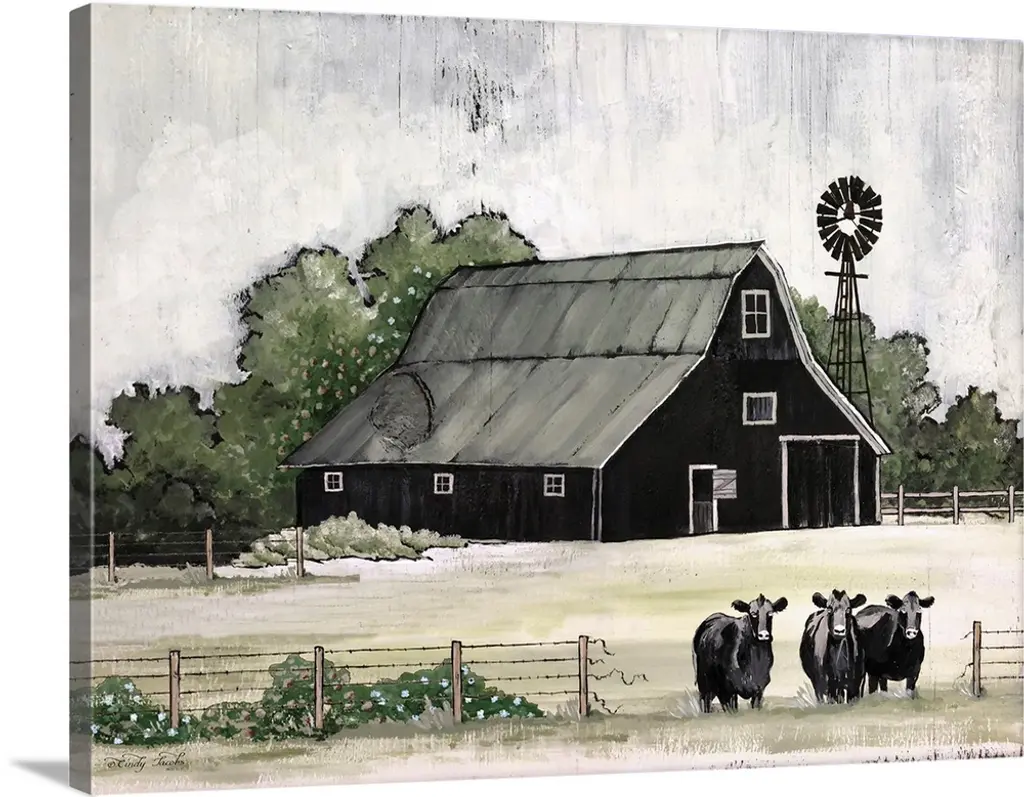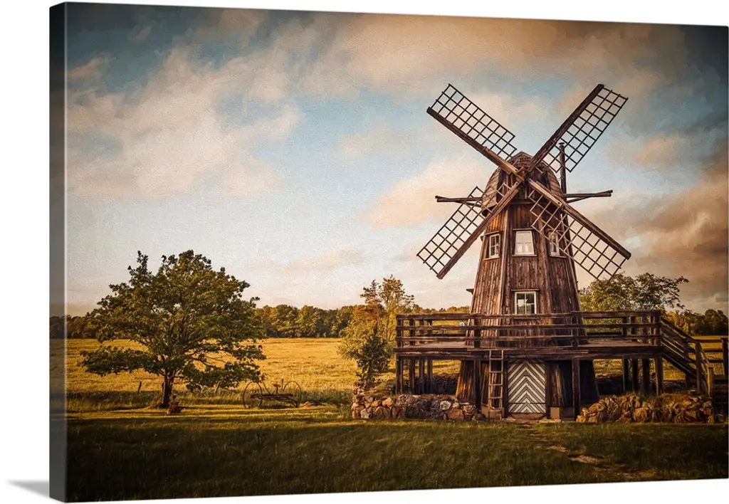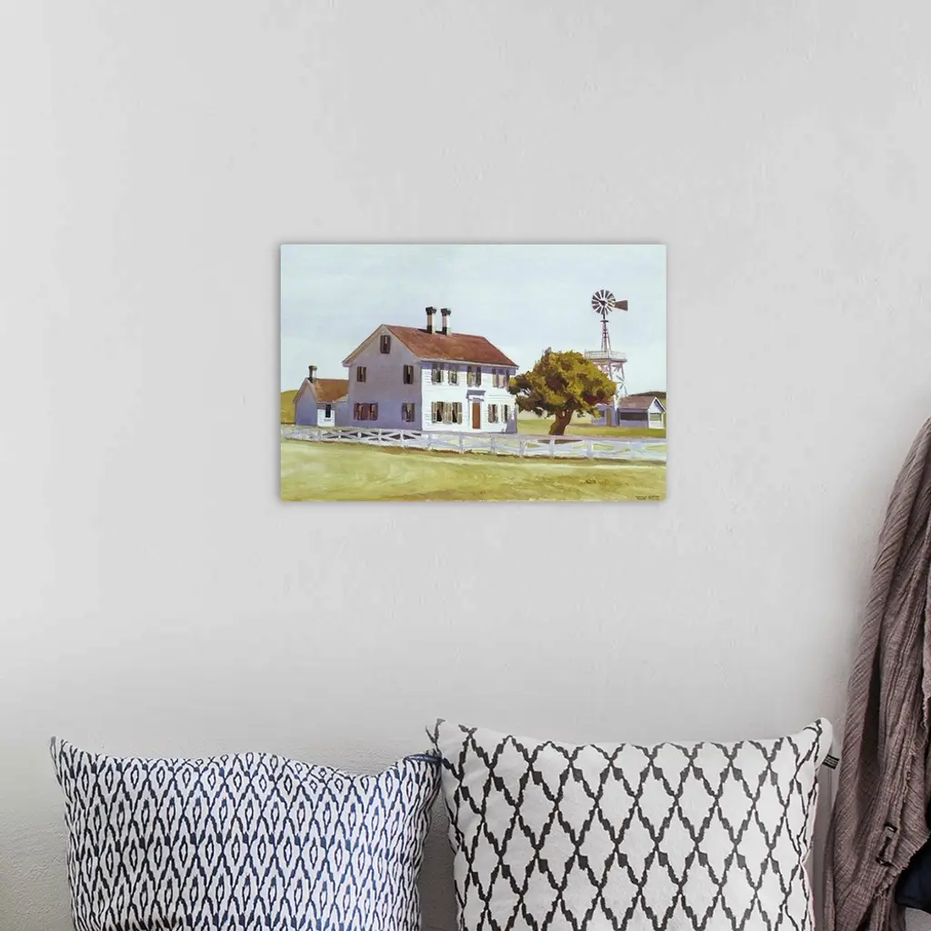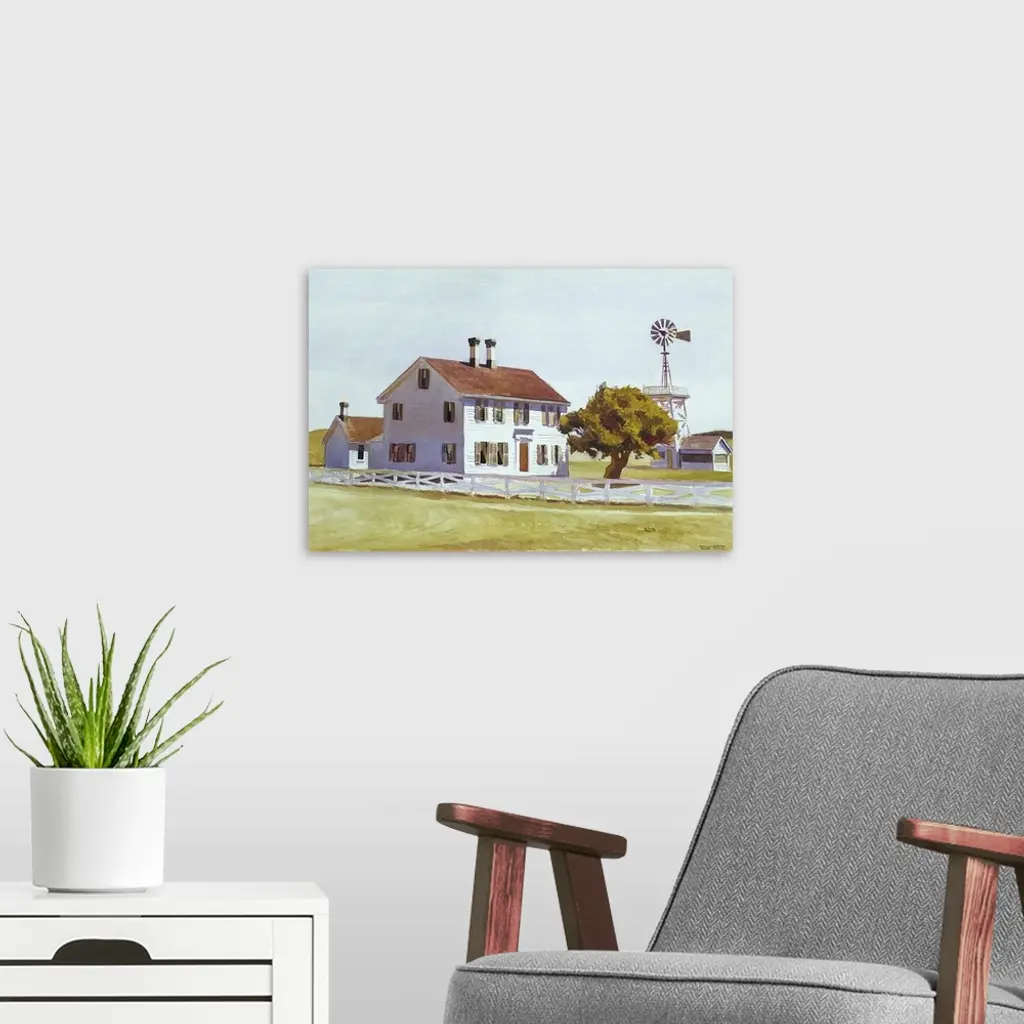 Painting of a white house with two chimneys in Cape Cod, Massachusetts with a single tree in the front yard and a windmill on the side.