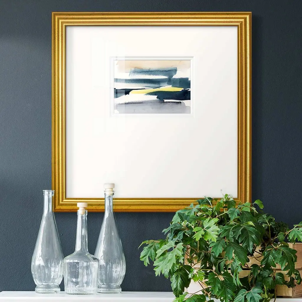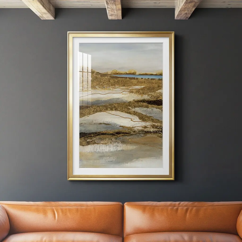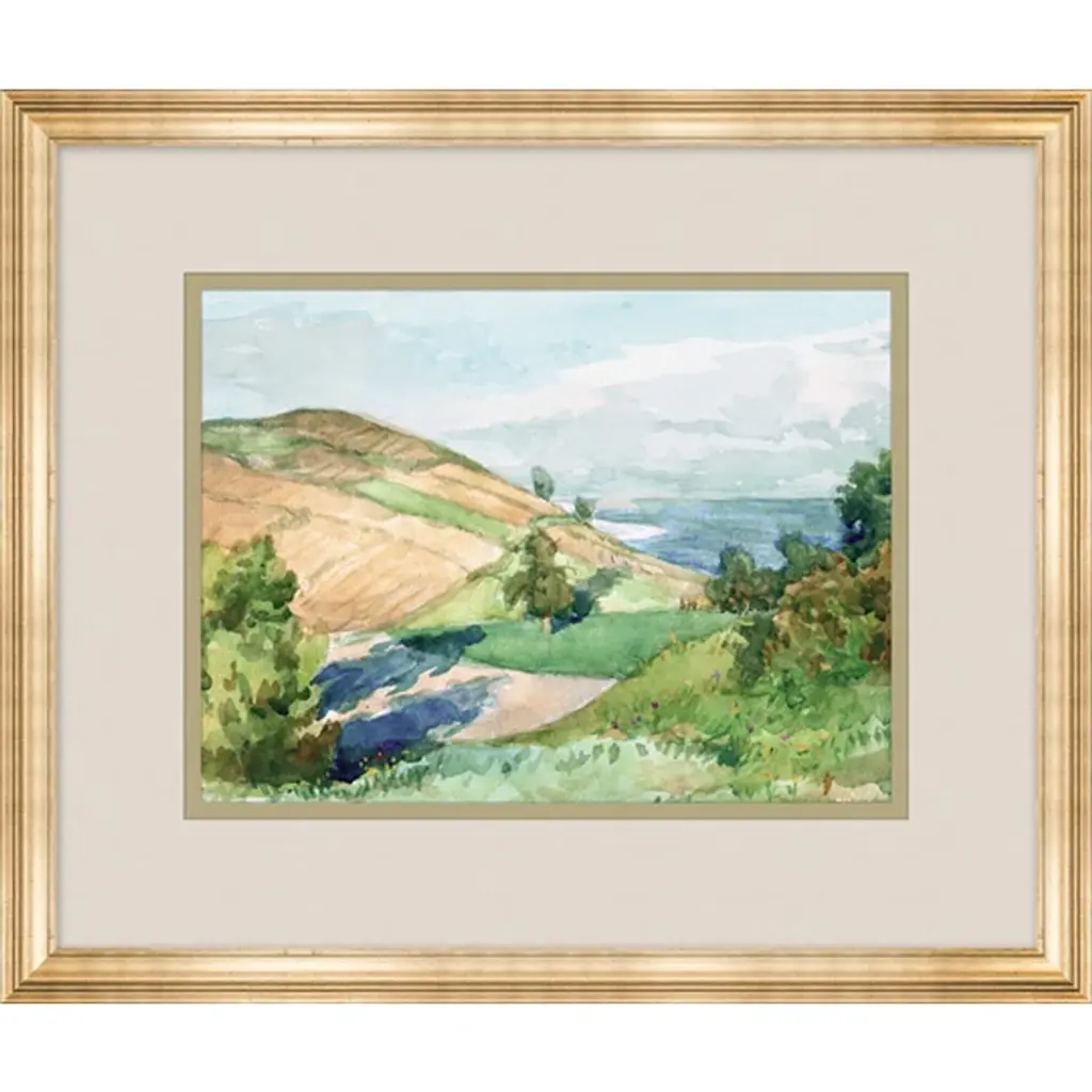 Something In The Orange by artist Rick Anderson showcases a gorgeous landscape realized in watercolor on canvas. Bordering the artwork is a gold fillet amongst a white background, imbuing the rural motif with a splash of opulent flair. The piece is gently nestled within a matching white frame with gold accents and steel hangers, completing the look.