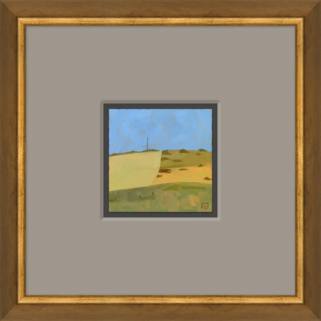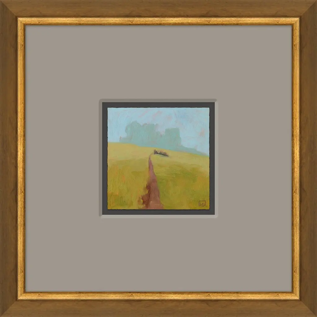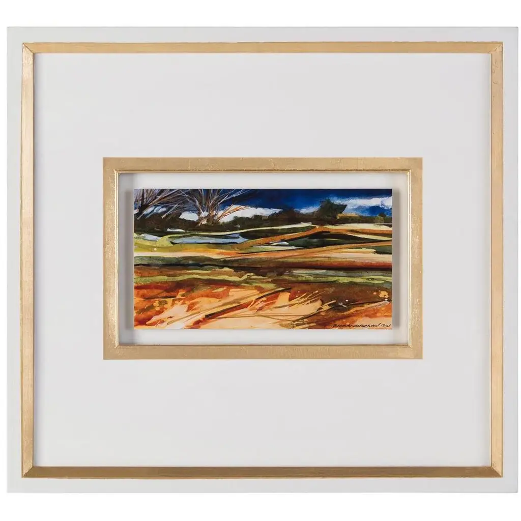 Something In The Orange by artist Rick Anderson showcases a gorgeous landscape realized in watercolor on canvas. Bordering the artwork is a gold fillet amongst a white background, imbuing the rural motif with a splash of opulent flair. The piece is gently nestled within a matching white frame with gold accents and steel hangers, completing the look.