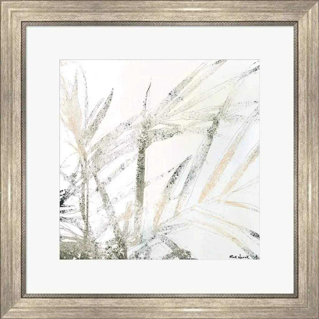 Palms 1 by Rick Novak is a high quality piece of framed artwork. The finished size of this piece is 22" X 22". It has a Classic Champagne Silver with Ornate Inner Edge frame, is single matted and finished with high quality Acrylic Plexiglass.